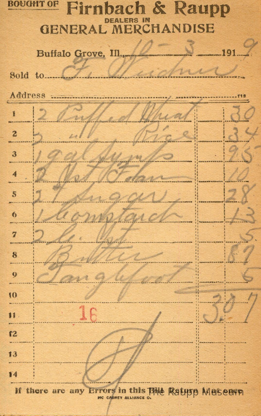 One (1) Firnbach and Raupp store receipt from October 3, 1919. Receipt is rectangular with black printed text and written notes in pencil. The receipt is for F. Weidner, who bought two Puffed Wheat for $0.30, two Puffed Rice for $0.34, one gallon of syrup for $0.95, two yeast foam for $0.10, two pounds of sugar for $0.28, one cornstarch for $0.13, two b. yeast (?) for $0.05, butter for $0.87, and Tanglefoot for $0.05. The bill total is $3.07 and the receipt is marked as paid. A red stamp of 16 is located towards the bottom of the page. The text from top to bottom is: BOUGHT OF Firnbach & Raupp; DEALERS IN GENERAL MERCHANDISE; Buffalo Grove, Ill.; Sold to; Address; If there are any Errors in this Bill Return It at once; MC CASKEY ALLIANCE O.Archive Details