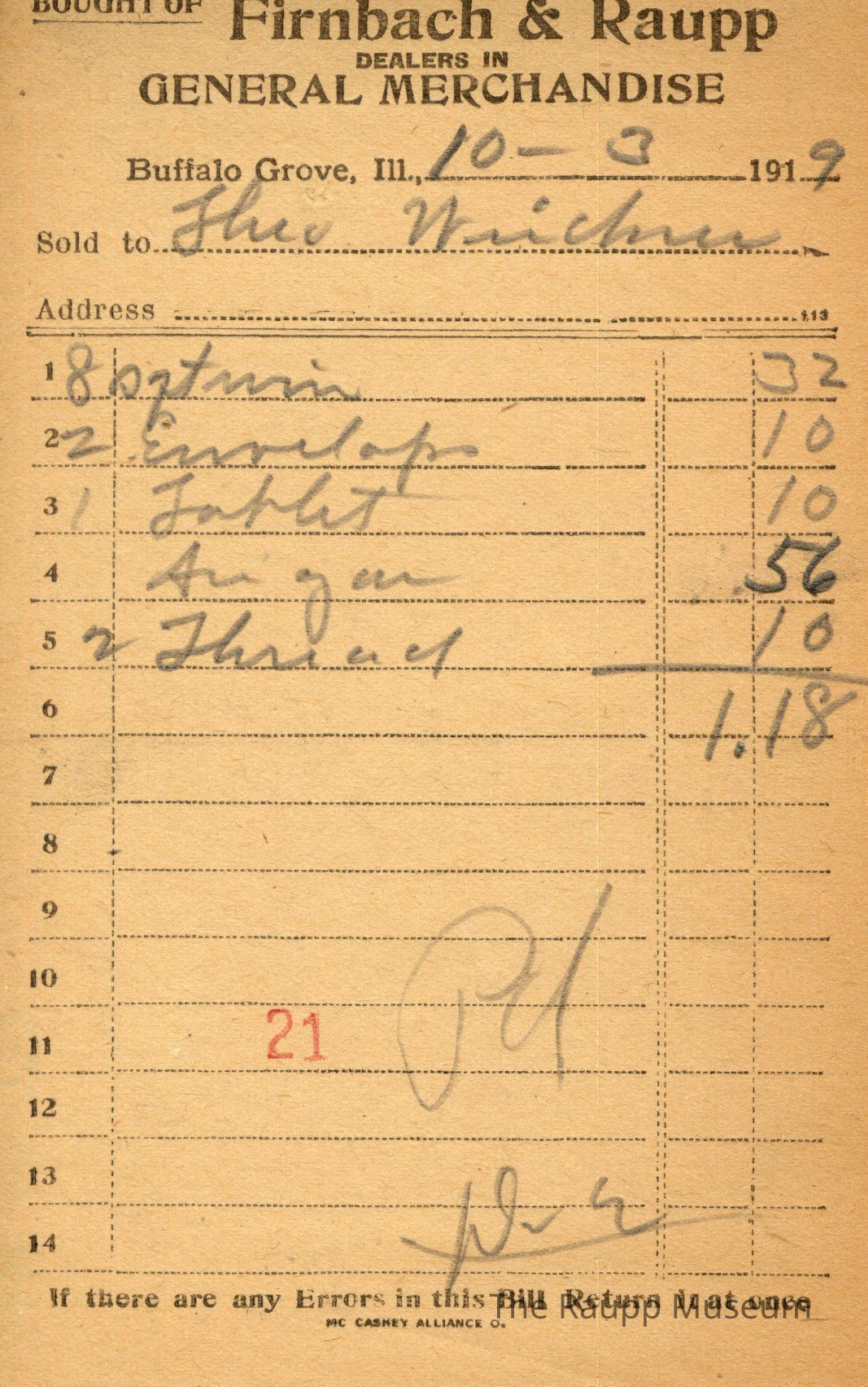 One (1) Firnbach and Raupp store receipt from October 3, 1919. Receipt is rectangular with black printed text and written notes in pencil. The receipt is for Theo Weidner, who bought eight aqturin (?)for $0.32, two envelopes for $0.10, one tablet for $0.10, sugar for $0.56, and two thread for $0.10. The bill total is $1.18 and the receipt is marked as paid. A red stamp of 21 is located towards the bottom of the page. The text from top to bottom is: BOUGHT OF Firnbach & Raupp; DEALERS IN GENERAL MERCHANDISE; Buffalo Grove, Ill.; Sold to; Address; If there are any Errors in this Bill Return It at once; MC CASKEY ALLIANCE O.Archive Details