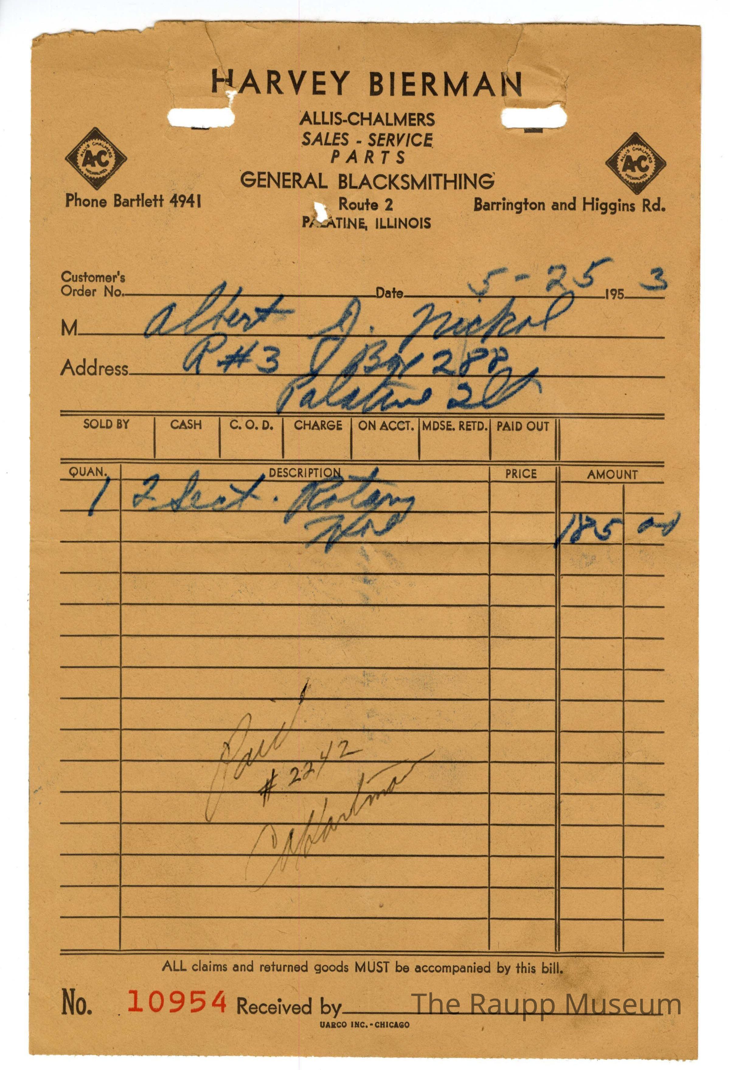 One (1) brown rectangular receipt from Harvey Bierman, General Blacksmithing, for Albert J. Nickol on May 5, 1953. Receipt contains pre-printed portions and handwritten portions in blue ink. Receipt is for 1, 2 sect. rotary hoe (?) for $185.00.Archive Details