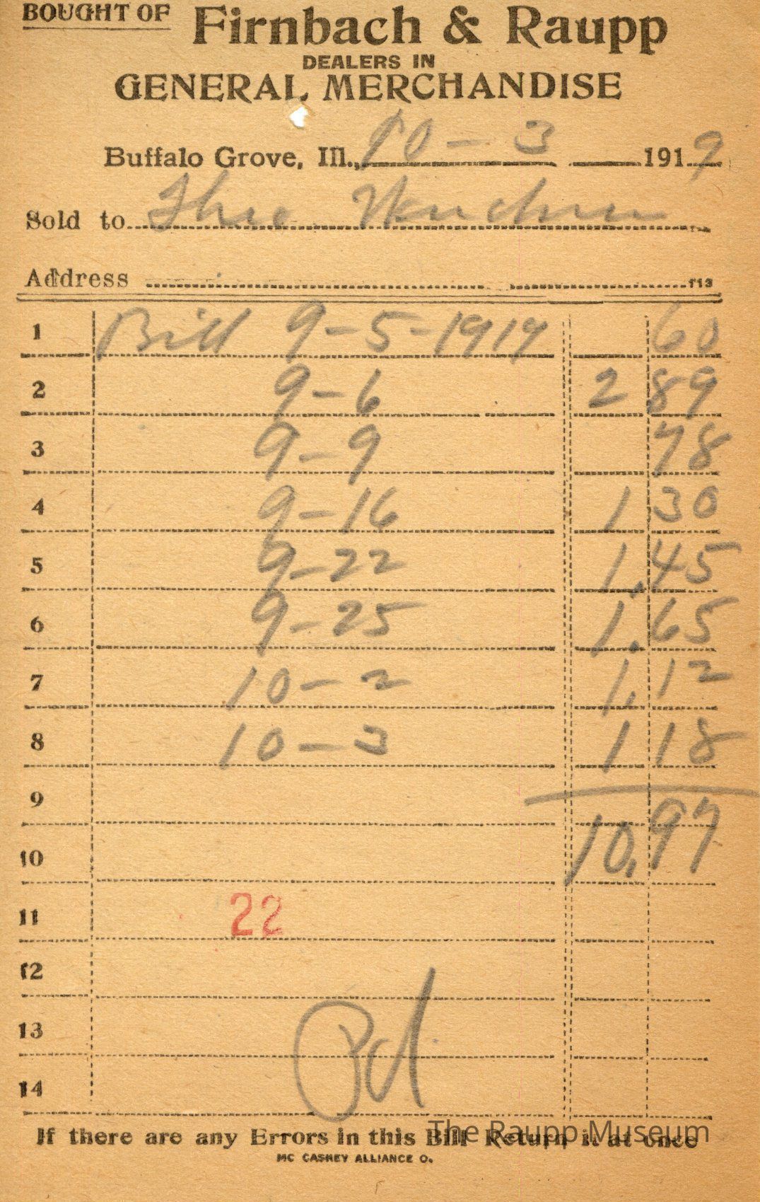 One (1) Firnbach and Raupp store receipt from October 3, 1919. Receipt is rectangular with black printed text and written notes in pencil. The receipt is for Theo Weidner, who paid the bills for his previous transactions at the general store (dated 9/5 for $0.60, 9/6 for $2.89, 9/9 for $0.78, 9/16 for $1.30, 9/22 for $1.45, 9/25 for $1.65, 10/2 for $1.12, 10/3 for $1.18). The bill total is $10.97 and the receipt is marked as paid. A red stamp of 22 is located towards the bottom of the page. The text from top to bottom is: BOUGHT OF Firnbach & Raupp; DEALERS IN GENERAL MERCHANDISE; Buffalo Grove, Ill.; Sold to; Address; If there are any Errors in this Bill Return It at once; MC CASKEY ALLIANCE O.Archive Details