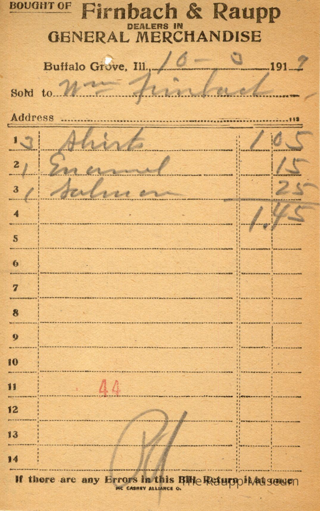 One (1) Firnbach and Raupp store receipt from October 3, 1919. Receipt is rectangular with black printed text and written notes in pencil. The receipt is for William Firnbach, who bought three shirts for $1.05, one enamel (?) for $0.15, and one salmon for $0.25. The bill total is $1.45 and the receipt is marked as paid. A red stamp of 44 is located towards the bottom of the page. The text from top to bottom is: BOUGHT OF Firnbach & Raupp; DEALERS IN GENERAL MERCHANDISE; Buffalo Grove, Ill.; Sold to; Address; If there are any Errors in this Bill Return It at once; MC CASKEY ALLIANCE O.Archive Details