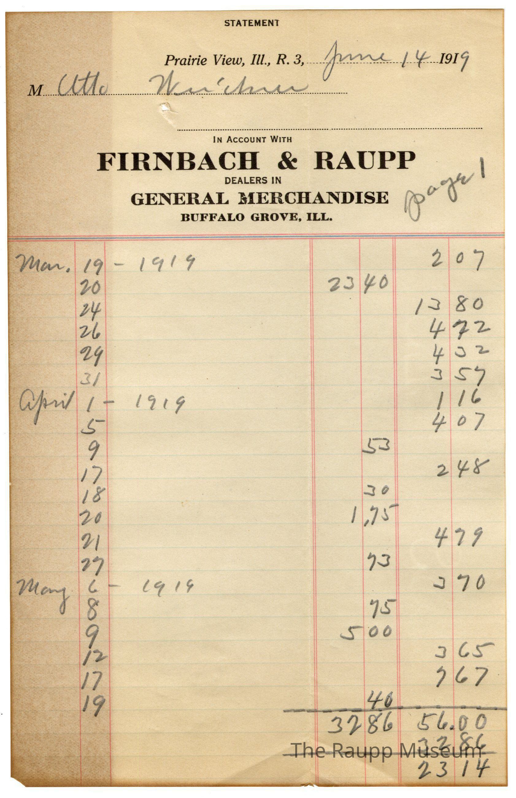 The black text is as follows, from top to bottom: STATEMENT; Prairie View, Ill., R. 3,; IN ACCOUNT WITH, FIRNBACH & RAUPP, DEALERS IN, GENERAL MERCHANDISE, BUFFALO GROVE, ILL.Archive Details