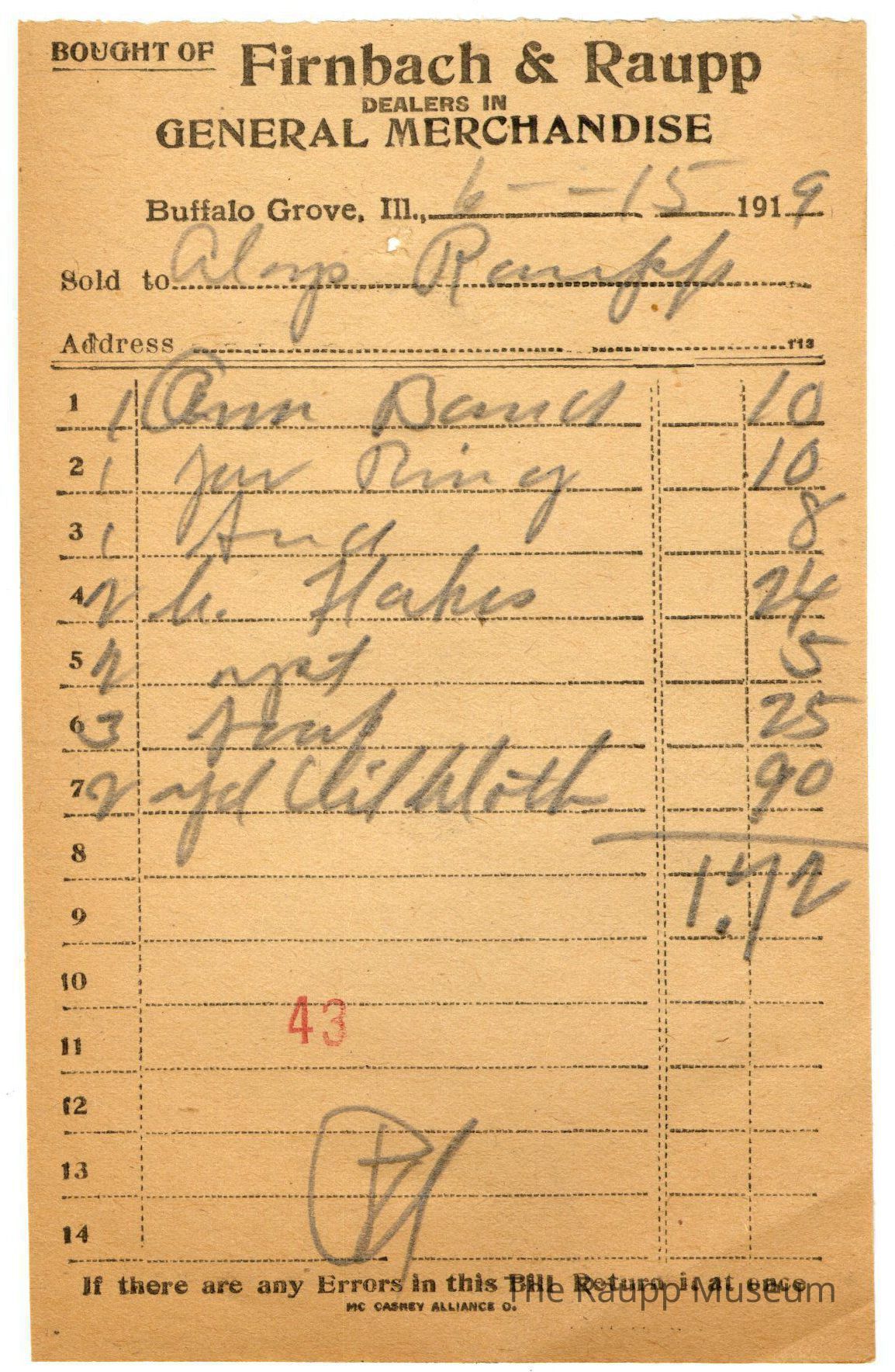 One (1) Firnbach and Raupp store receipt from June 15, 1919. Receipt is rectangular with black printed text and written notes in pencil. The receipt is for Aloys Raupp who bought one unknown for $0.10, one jar ring for $0.10, one unknown for $0.08, two C. Flakes (cornflakes) for $0.24, two yst (yeast) for $0.05, three soap for $0.25, and two yd (yard) oil cloth for $0.90. Bill total is $1.72. There's a red stamp of 43 close to the bottom, with the bill marked as paid (written as "Pd.").