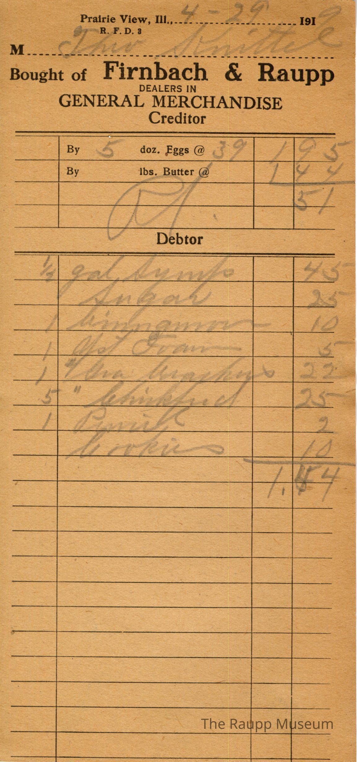 The black text is as follows, from top to bottom: Prairie View, Ill.,; Bought of Firnbach & Raupp; Dealers in GENERAL MERCHANDISE Creditor; By doz. Eggs @; By lbs Butter @; Debtor.Archive Details