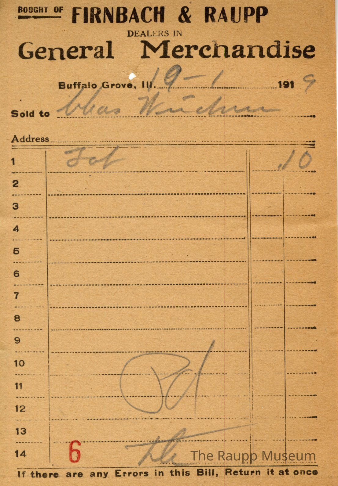 One (1) Firnbach and Raupp store receipt from October 1, 1919. Receipt is rectangular with black printed text and written notes in pencil. The receipt is for Lhas Weidner (?), who bought a tub (?) for $0.10. The bill total is $0.10 and the receipt is marked as paid. A red stamp of 6 is located towards the bottom of the page. The text from top to bottom is: BOUGHT OF Firnbach & Raupp; DEALERS IN GENERAL MERCHANDISE; Buffalo Grove, Ill.; Sold to; Address; If there are any Errors in this Bill Return It at onceArchive Details