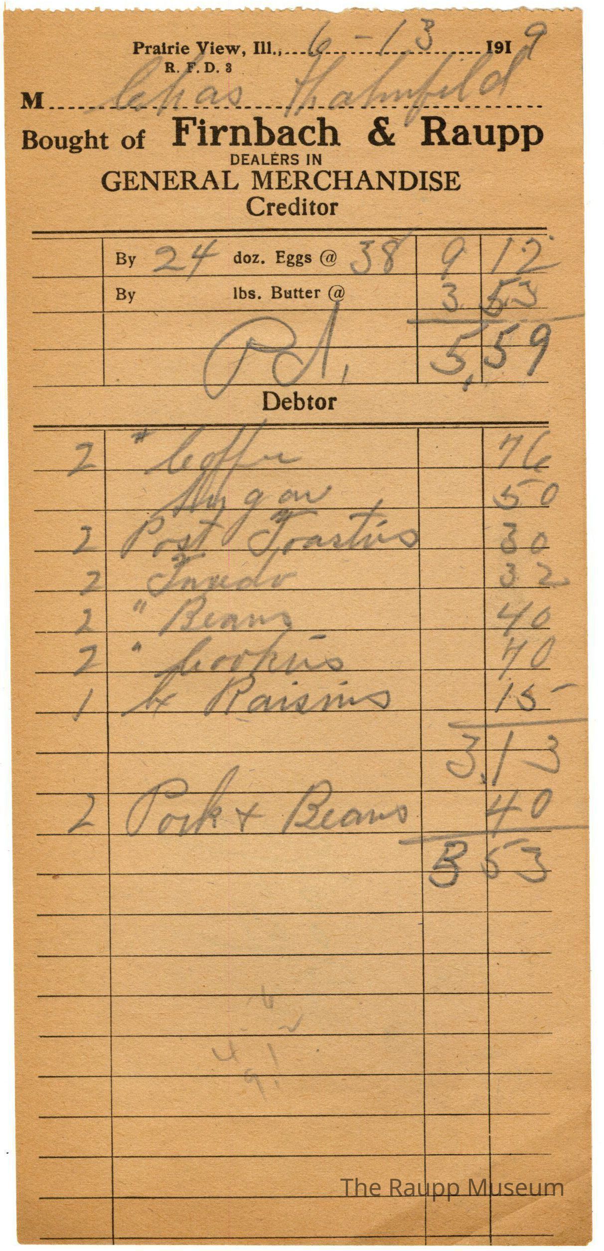 One (1) Firnbach and Raupp store receipt from June 13, 1919. Receipt is rectangular with black printed text and written notes in pencil. The receipt is for Chas Hahnfeld, who bought two pounds of coffee for $0.76, sugar for $0.50, two post Toasties for $0.30, two tuxedo for $0.32, two pounds beans for $0.40, two pounds cookies for $0.40, one bx (box) of raisins for $0.15, and two pork and beans for $0.40. Bill total was $3.13; however, the pork and beans was added at $0.15 bringing the total bill to $3.53. Chas Hahnfeld brought in 24 dozen eggs at $0.38 per dozen to receive a total credit of $9.12; however, the deduction of the $3.53 bill brought the credit to $5.59. The bill is marked as paid (Pd.) at the top of the page. On the front of the receipt a math equation with the numbers 4, 6, and 9.12 are written at the bottom. On the back of the receipt a math equation is written with the numbers 38, 5 (? number obtained by dividing 190 by the number 38 to obtain 5), 1.90, 19, and 209.