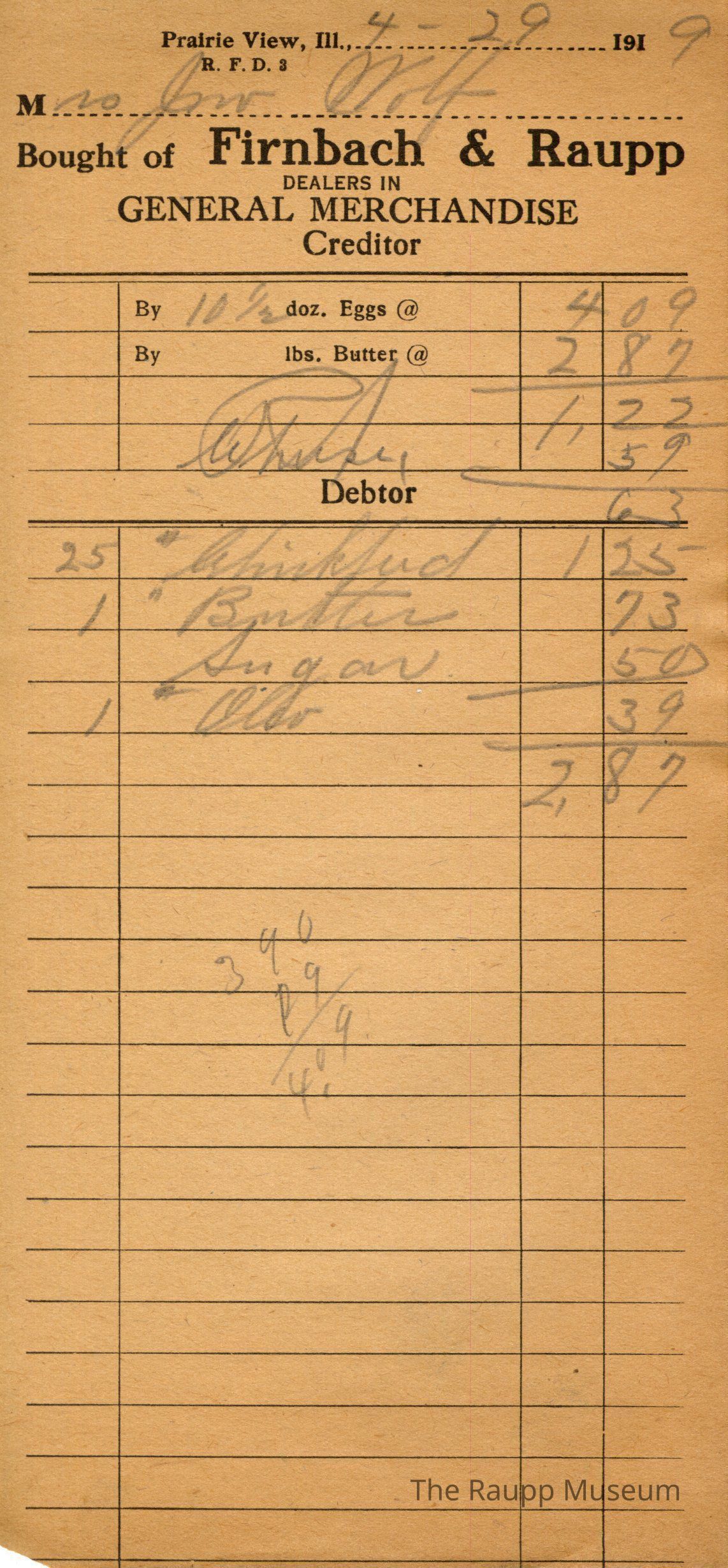 One (1) Firnbach and Raupp store receipt from April 29, 1919. Receipt is rectangular with black printed text and written notes in pencil. The receipt is for Mrs. (?), who sold 10 1/2 dozen eggs for $4.09. The credit is marked as paid. She bought 25 pounds of chickfeed for $1.25, 1 pound of butter for $0.73, sugar for $0.50, 1 pound of oleo for $0.39, and cheese for $0.59. She was paid $0.63 by the store. There is math written near the center of the receipt.