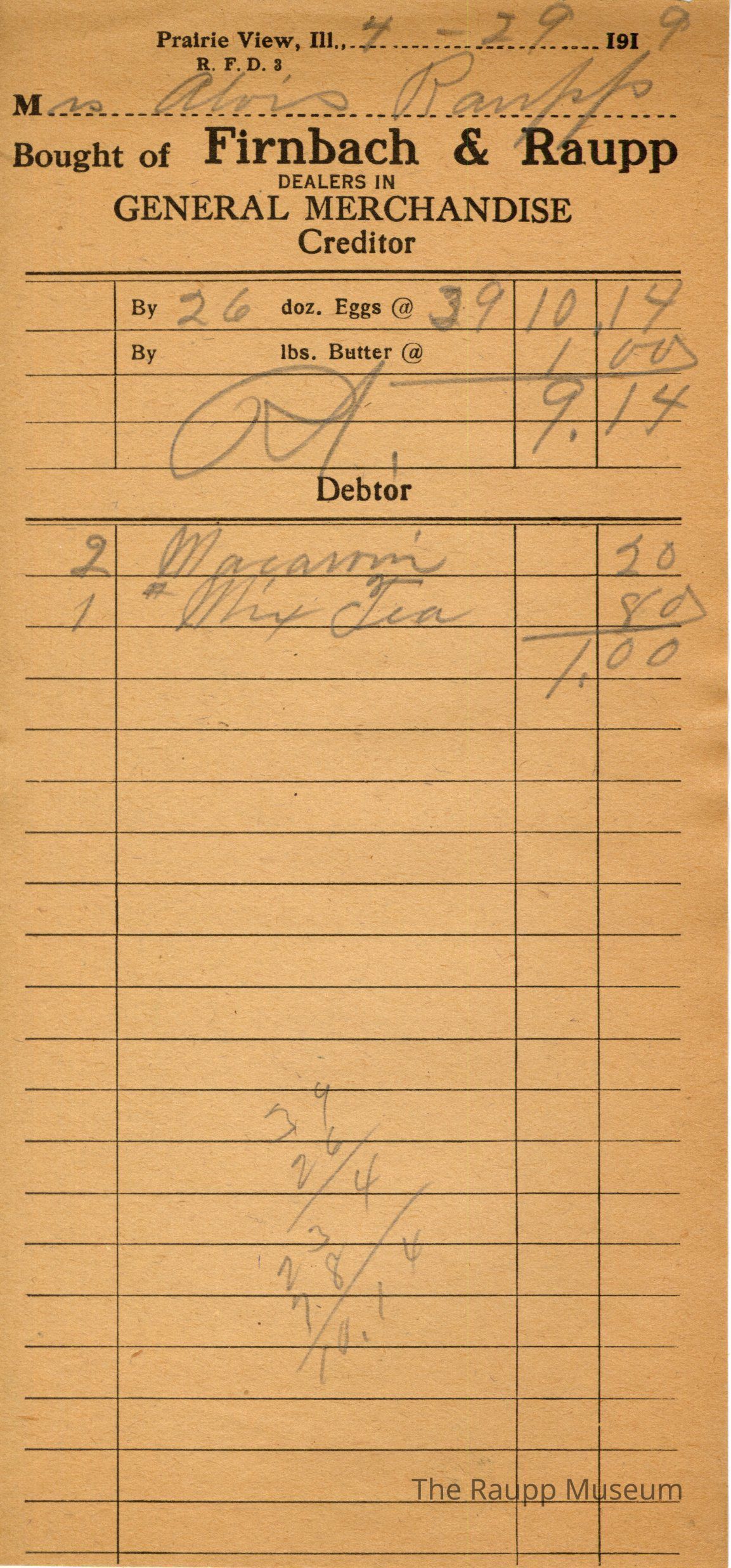 One (1) Firnbach and Raupp store receipt from April 29, 1919. Receipt is rectangular with black printed text and written notes in pencil. The receipt is for Mrs. Alois Raupp, who sold 26 dozen eggs at $0.39 for $10.14. The credit is marked as paid. She bought 2 macaroni for $0.20 and 1 pound of mix tea for $0.80. Bill total was $1.00. There is math in the lower part of the receipt.