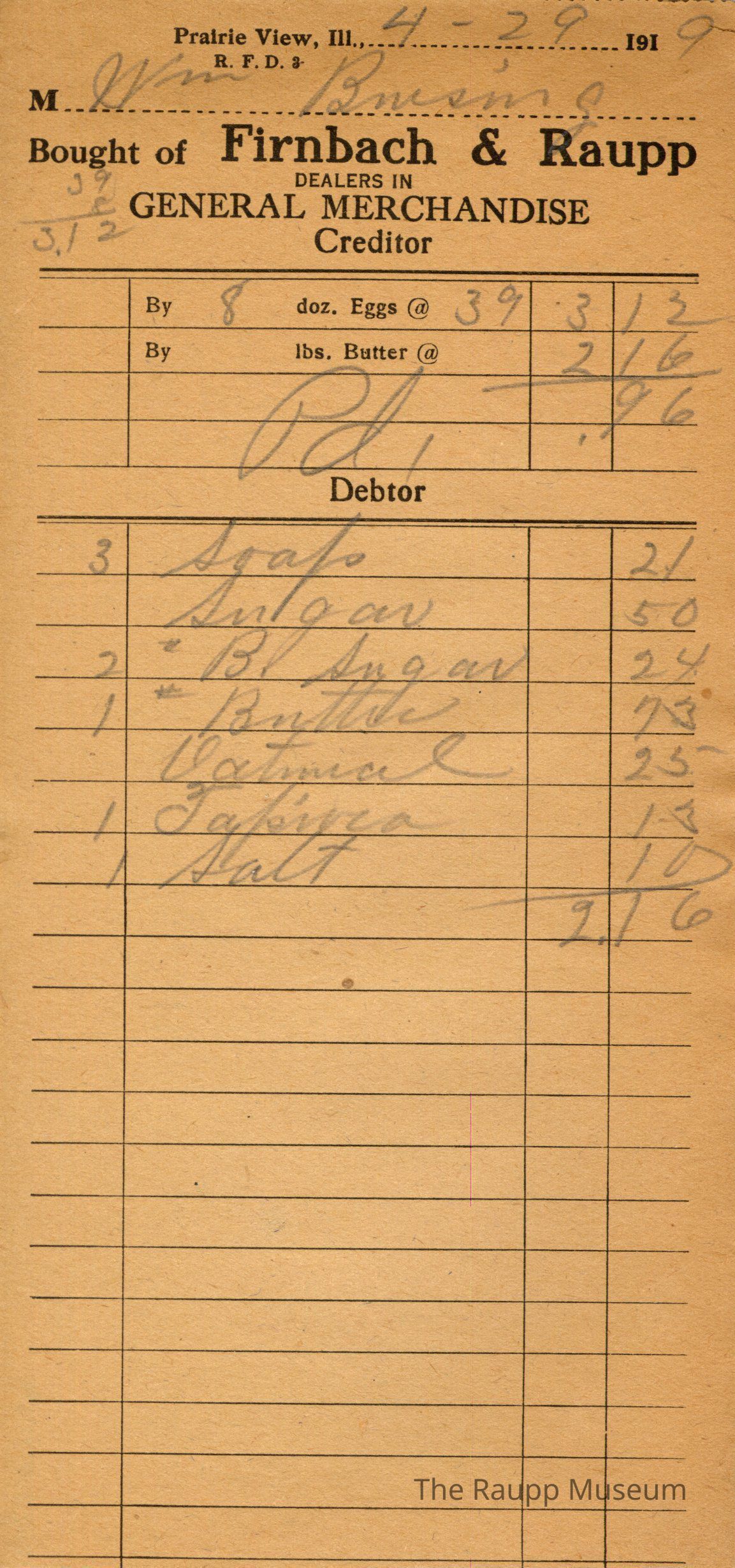 One (1) Firnbach and Raupp store reciept from April 29, 1919. Receipt is rectangular with black printed text and written notes in pencil. The receipt is for William (?), who sold 8 dozen eggs at $0.39 for $3.12. The credit is marked as paid. He bought 3 soap for $0.21, sugar for $0.50, 2 pound of b. sugar for $0.24, 1 pound of butter for $0.73, oatmeal for $0.25, 1 tapioca for $0.13, and 1 salt for $0.10. Bill total was $2.16. There is math in the upper left corner.