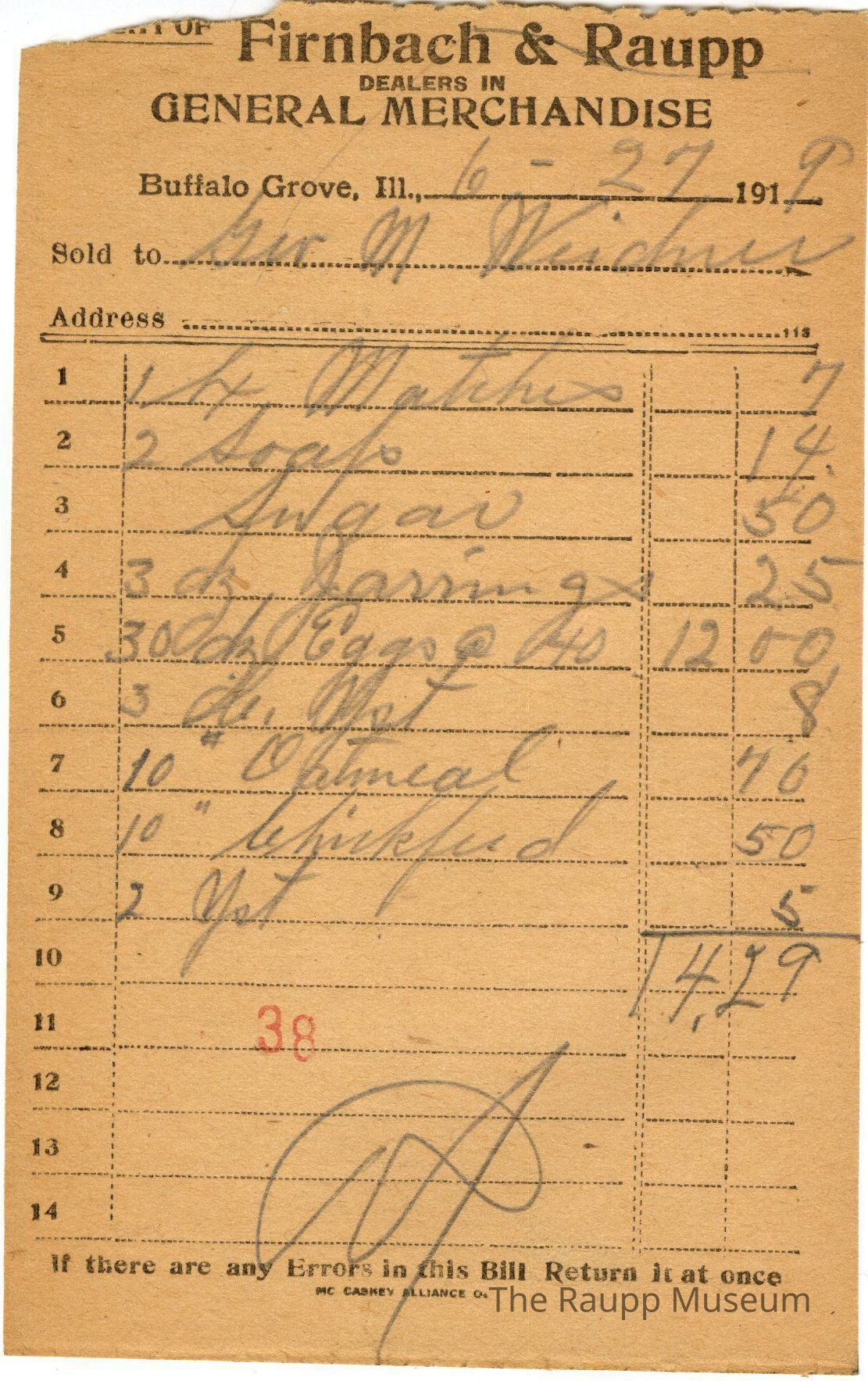 One (1) Firnbach and Raupp store receipt from June 27, 1919. Receipt is rectangular with black printed text and written notes in pencil. The receipt is for Geo M. Weidner, who bought one box of matches for $0.07, two soap for $0.14, sugar for $0.50, three dz (dozen) jarring for $0.25, 30 dz (dozen) eggs at $0.40 for $12.00, three (?) for $0.08, ten pounds of oatmeal for $0.70, 10 pounds chickfeed for $0.50, and two yst (yeast) for $0.05. The bill total is $14.29