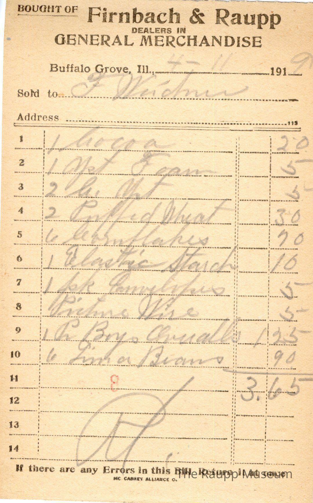 The black text is as follows, from top to bottom: Bought of Firnbach & Raupp; Dealers in GENERAL MERCHANDISE; Buffalo Grove, Ill.,; Sold to; Address; If there are any errors in this bill return it at once; MC Caskey Alliance Co.Archive Details