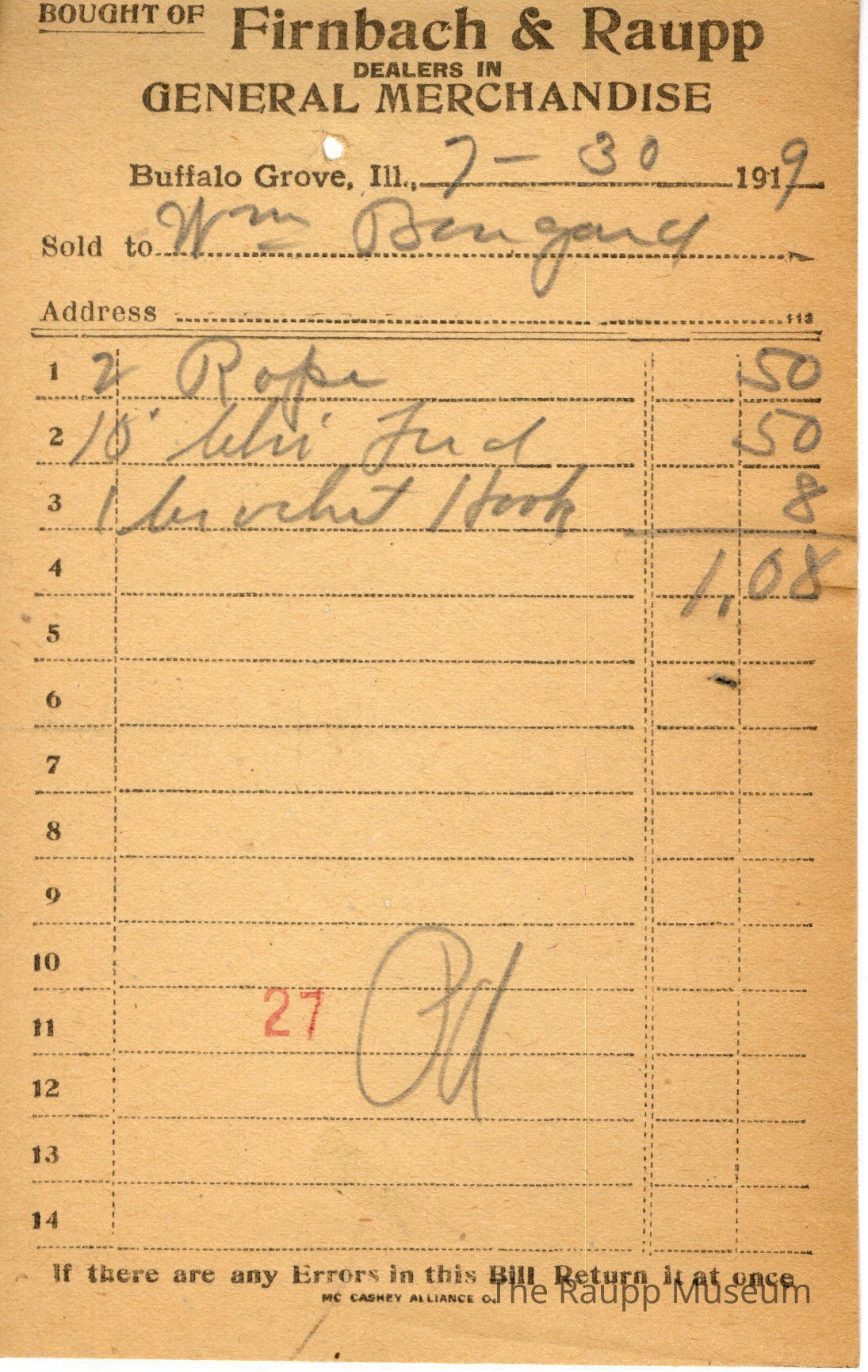 One (1) Firnbach and Raupp store receipt from July 30, 1919. Receipt is rectangular with black printed text and written notes in pencil. The receipt is for Wm Bougard, who bought 2 rope for $0.50, 10 (?) for $0.50 and 1 crochet hook for $0.08. The bill total is $1.08. There is a red stamp of "27" at the bottom, and the bill is marked as paid.