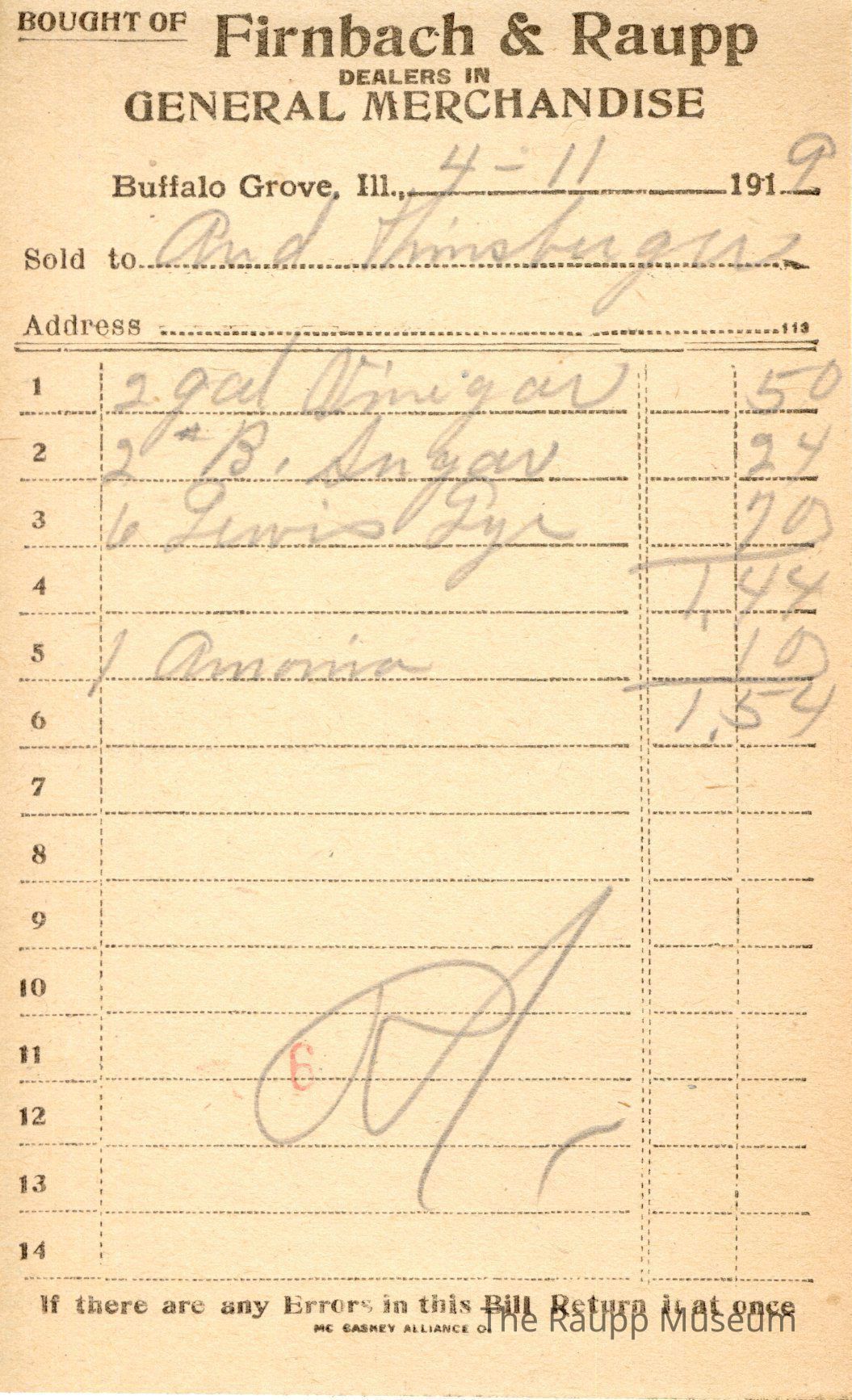 One (1) Firnbach and Raupp store receipt from April 11, 1919. Receipt is rectangular with black printed text and written notes in pencil. The receipt is for And Hinsberger(?), who bought 2 gal of vinegar for $0.50, 2 pounds of brown sugar for $0.24, 6 Lewis Lye for $0.70, and 1 amonia for $0.10. Bill total was $1.54. There is a red "6" stamp near the bottom of the bill. The bill is marked as paid.