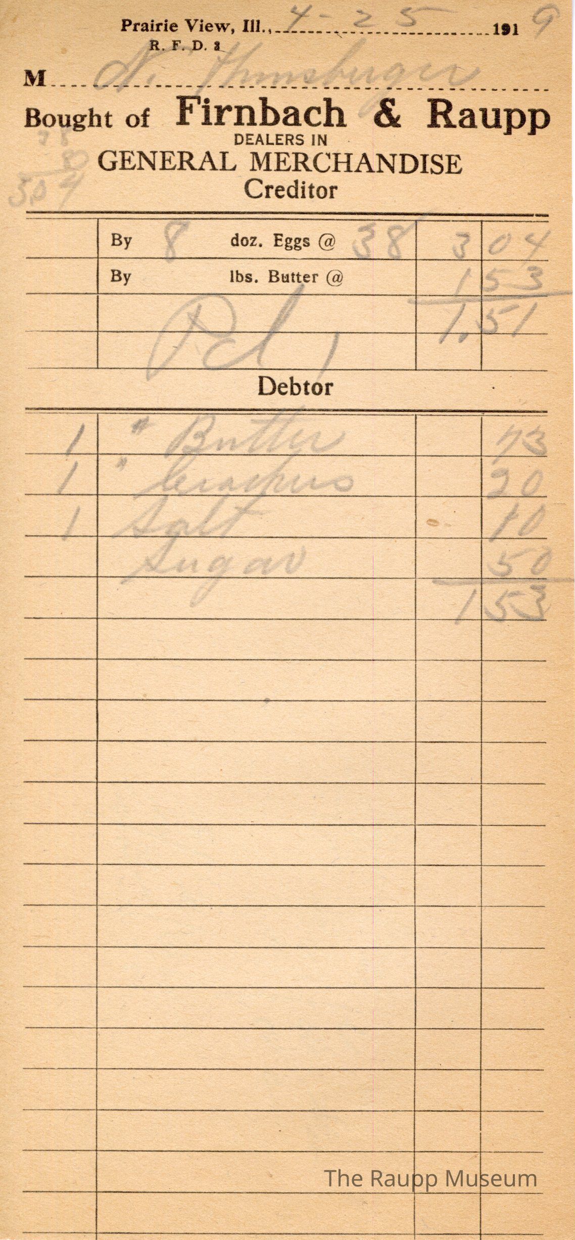 The black text is as follows, from top to bottom: Prairie View, Ill.,; Bought of Firnbach & Raupp; Dealers in GENERAL MERCHANDISE Creditor; By doz. Eggs @; By lbs Butter @; Debtor.Archive Details