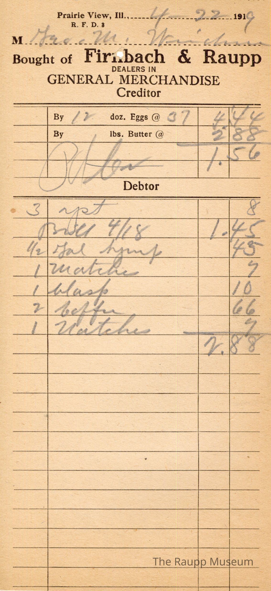 The black text is as follows, from top to bottom: Prairie View, Ill.,; Bought of Firnbach & Raupp; Dealers in GENERAL MERCHANDISE Creditor; By doz. Eggs @; By lbs Butter @; Debtor.Archive Details