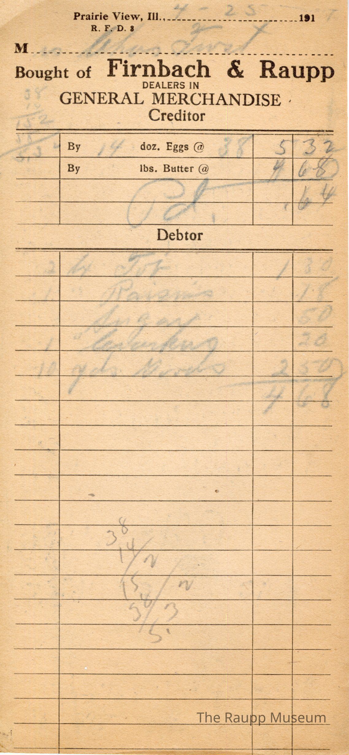 The black text is as follows, from top to bottom: Prairie View, Ill.,; Bought of Firnbach & Raupp; Dealers in GENERAL MERCHANDISE Creditor; By doz. Eggs @; By lbs Butter @; Debtor.Archive Details