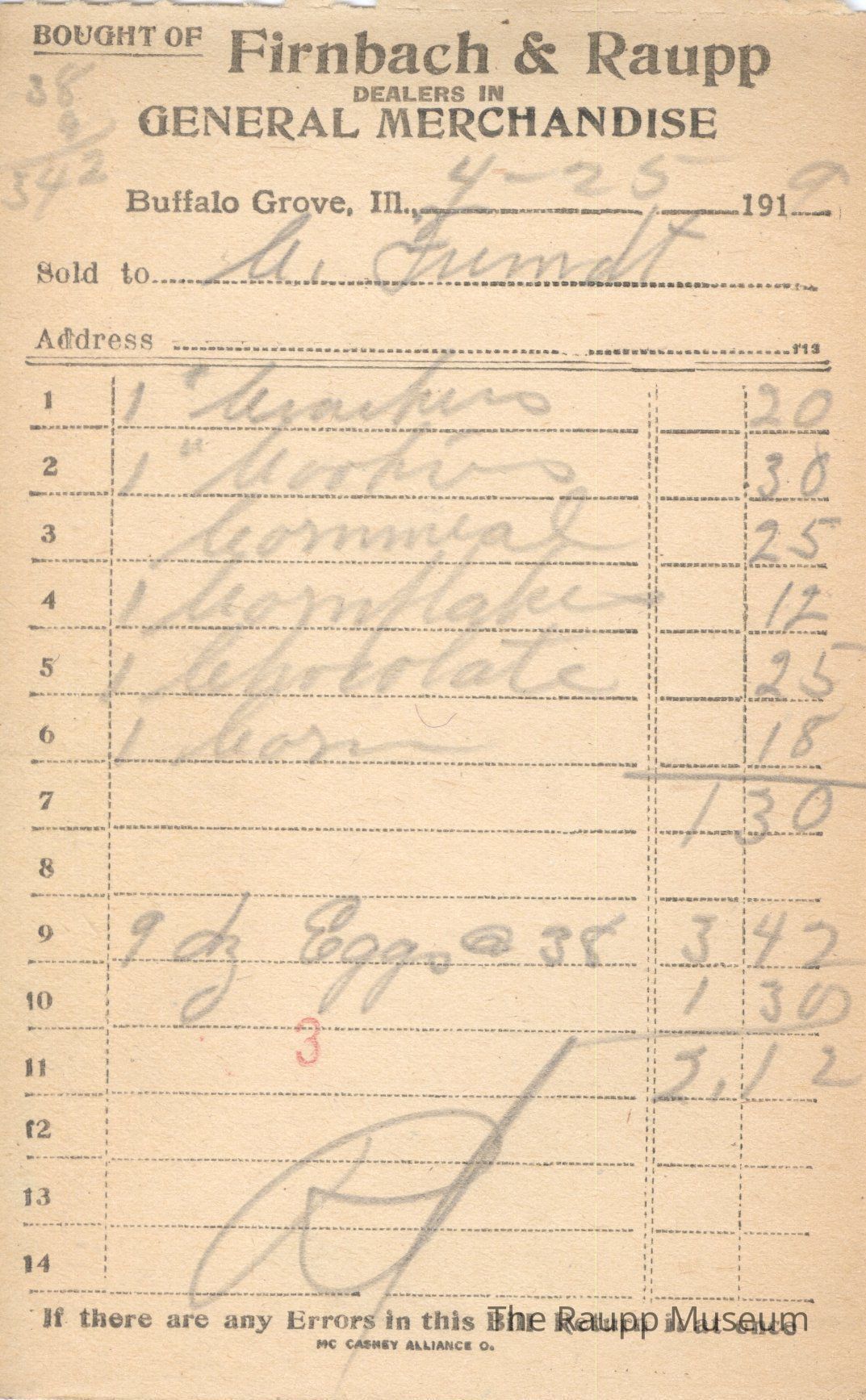 The black text is as follows, from top to bottom: Bought of Firnbach & Raupp; Dealers in GENERAL MERCHANDISE; Buffalo Grove, Ill.,; Sold to; Address; If there are any errors in this bill return it at once; MC Caskey Alliance Co.Archive Details
