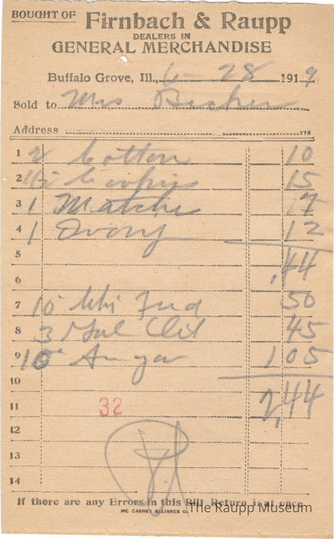 The black text is as follows, Bought of Firnbach and Raupp; Dealers in; General Merchandise; Buffalo Grove Ill.; Sold to; Address; If there are any Errors in this Bill Return it at once; MC CASKEY ALLIANCE O.