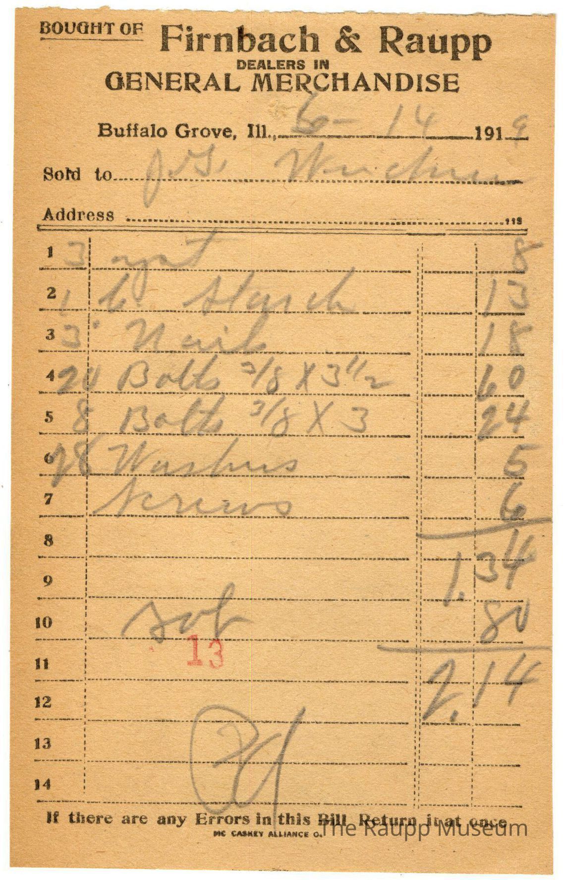 The black text is as follows, from top to bottom: Bought of Firnbach & Raupp, Dealers in GENERAL MERCHANDISE; Buffalo Grove Ill.; Sold to; Address; If there are any Errors in this Bill Return it at once; MC CASKEY ALLIANCE O.Archive Details