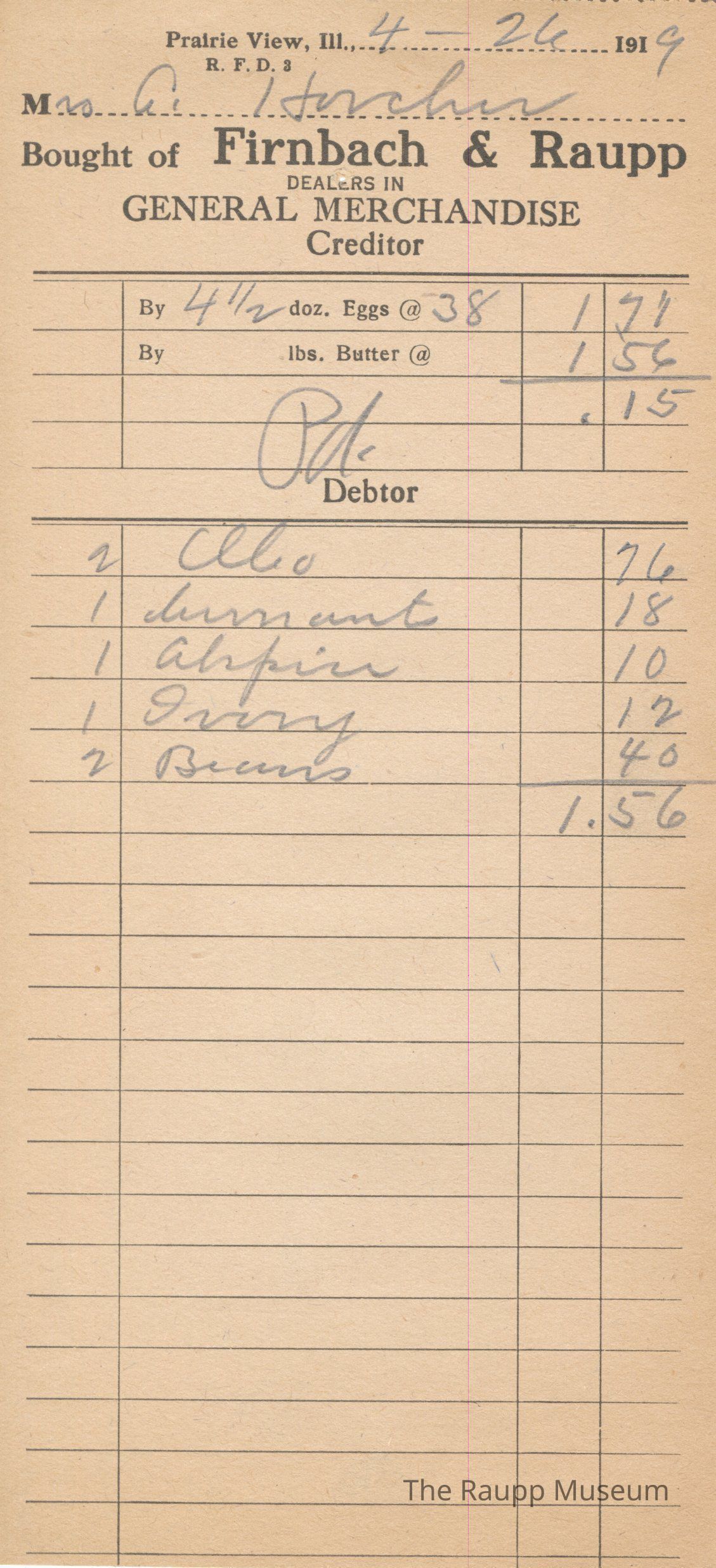 The black text is as follows, from top to bottom: Prairie View, Ill.,; Bought of Firnbach & Raupp; Dealers in GENERAL MERCHANDISE Creditor; By doz. Eggs @; By lbs Butter @; Debtor.Archive Details