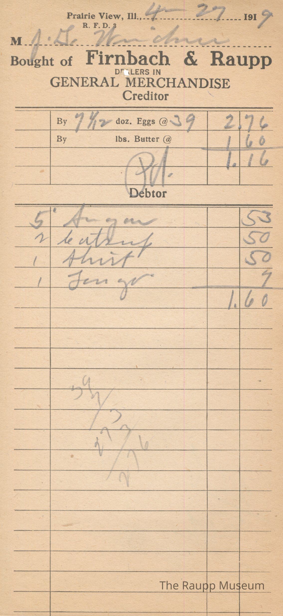 One (1) Firnbach and Raupp store receipt from April 27, 1919. Receipt is rectangular with black printed text and written notes in pencil. The receipt is for J. G. Weidner, who sold 7 1/2 dozen eggs at $0.39 for $2.76. He bought 5 pounds of sugar for $0.53, 2 catsup for $0.50, 1 shirt for $0.50, and 1 (?) for $0.07. Bill total of $1.60 was subtracted from $2.76. He was paid $1.16 in credit. The bill is marked as paid. There is math written in the center of the receipt as well as on the back.