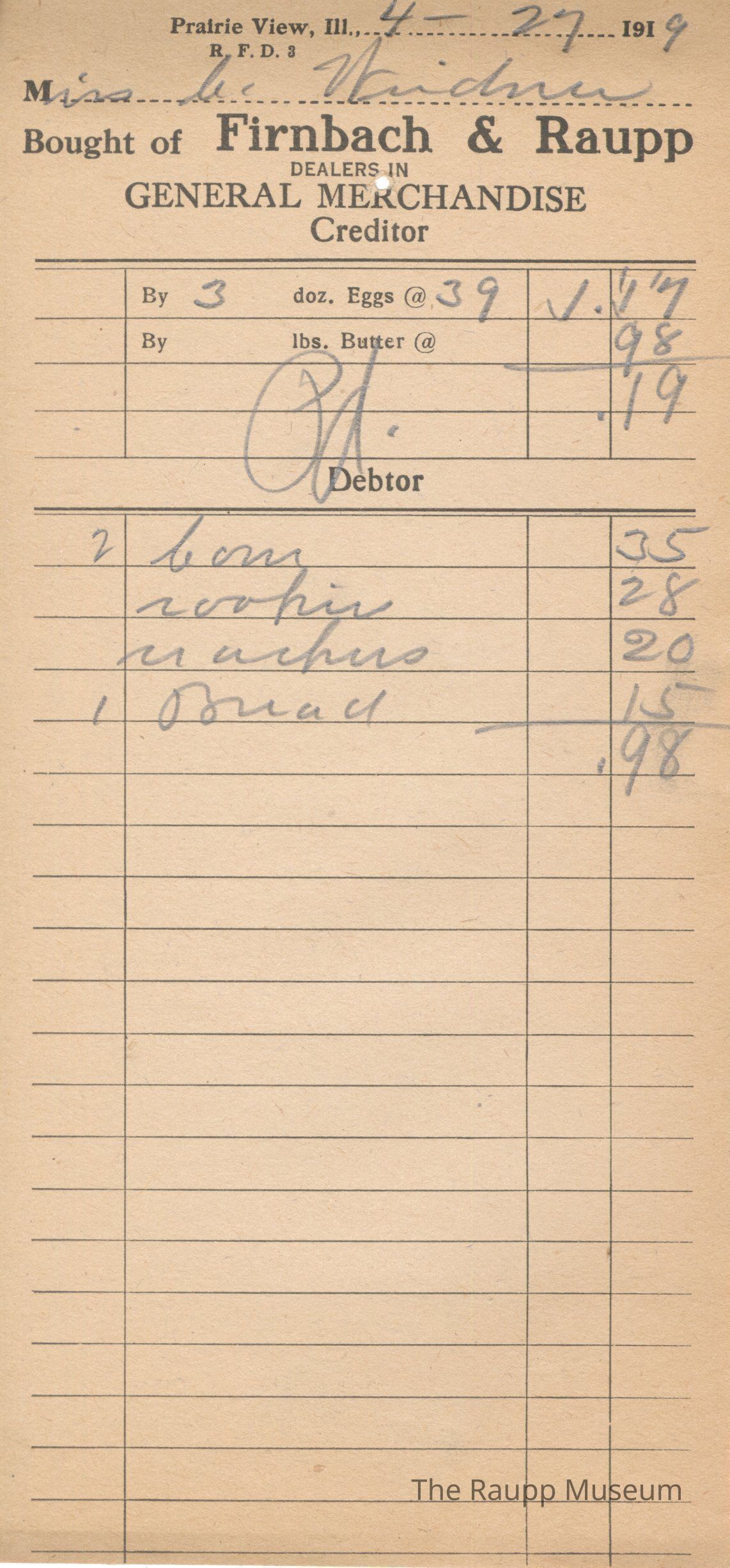 One (1) Firnbach and Raupp store receipt from April 27, 1919. Receipt is rectangular with black printed text and written notes in pencil. The receipt is for Miss C. Weidner, who sold 3 dozen eggs at $0.39 for $1.17. She bought 2 corn for $0.35, cookies for $0.28, crackers for $0.20, and 1 bread for $0.15. Bill total of $0.98 was subtracted from $1.17. She was paid $0.19 in credit. The bill is marked as paid.