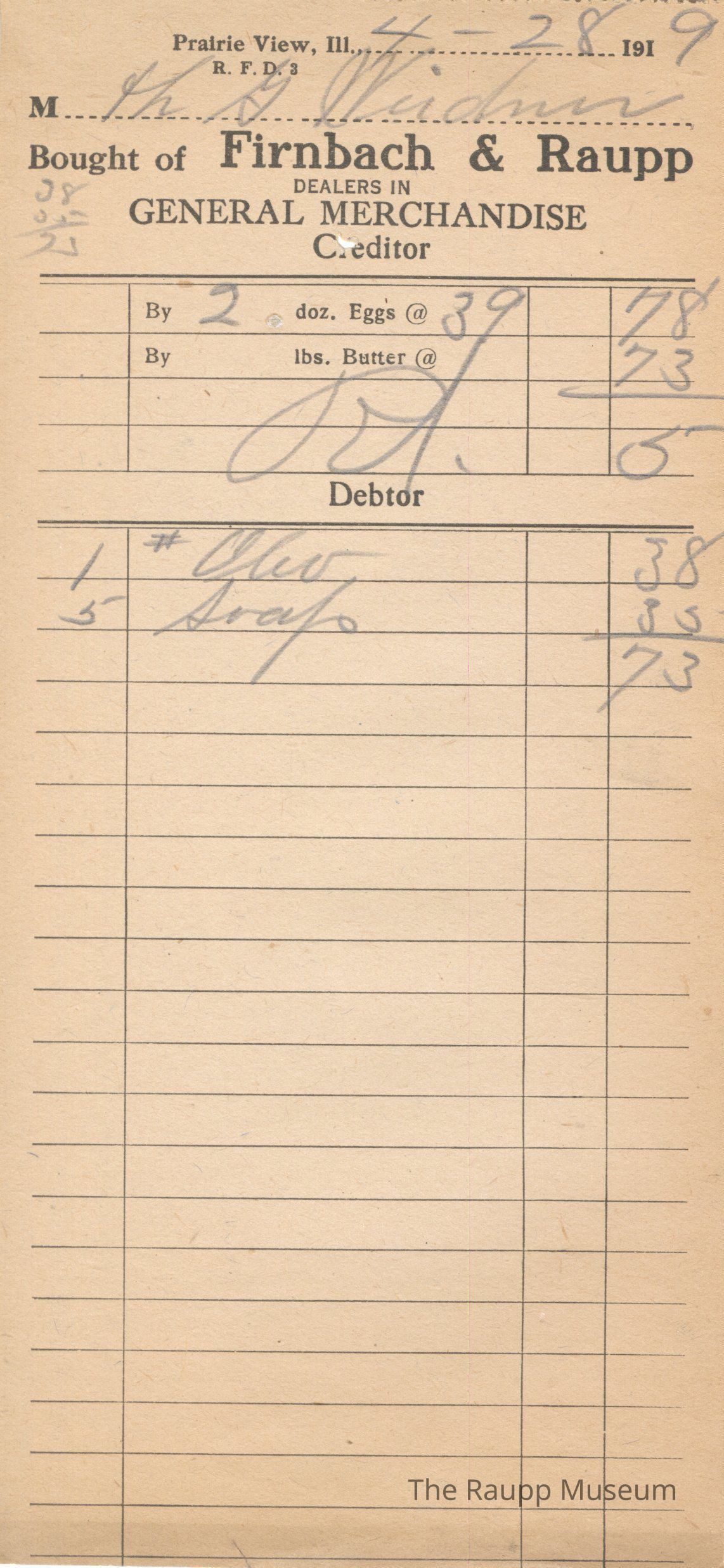 The black text is as follows, from top to bottom: Prairie View, Ill.,; Bought of Firnbach & Raupp; Dealers in GENERAL MERCHANDISE Creditor; By doz. Eggs @; By lbs Butter @; Debtor.Archive Details