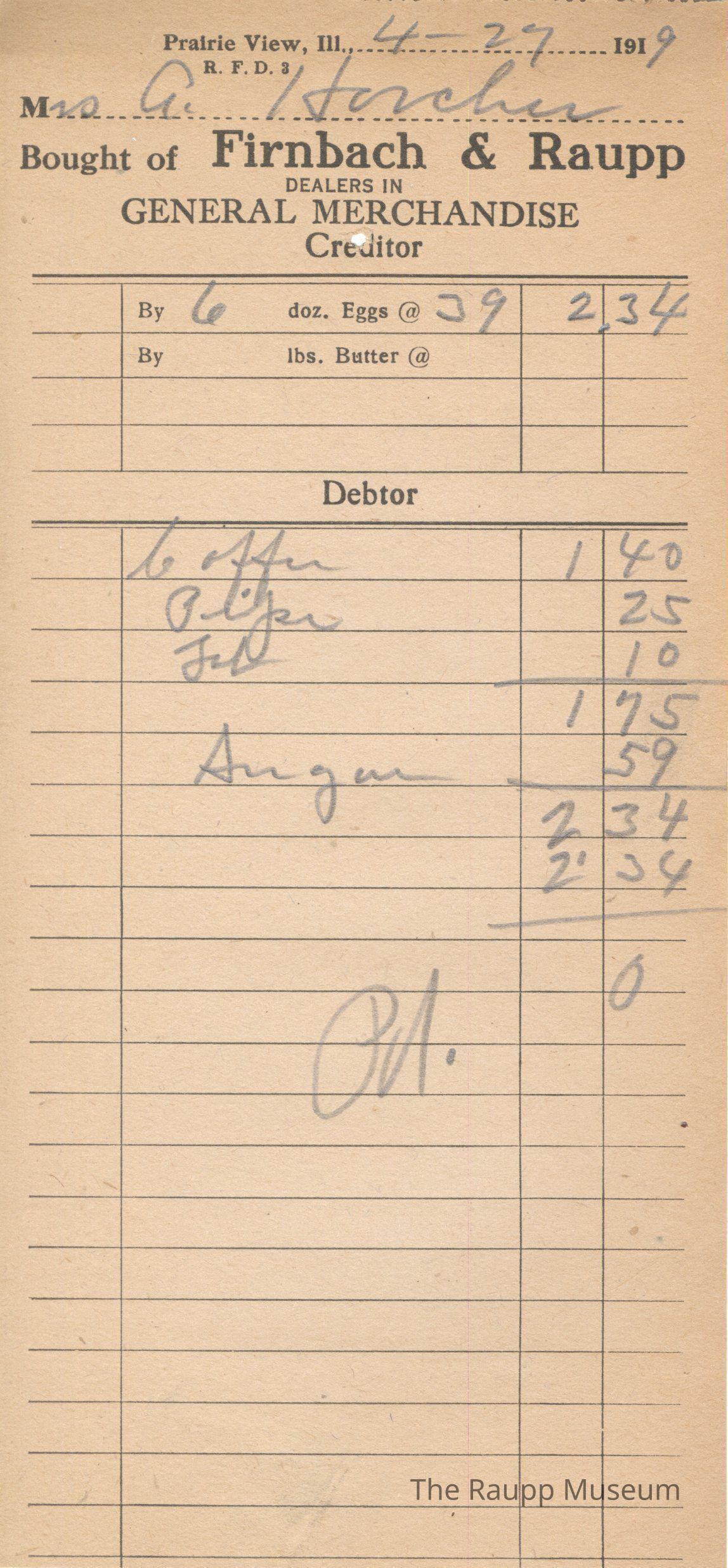 One (1) Firnbach and Raupp store receipt from April 27, 1919. Receipt is rectangular with black printed text and written notes in pencil. The receipt is for Mrs. A. Horcher, who sold 6 dozen eggs at $0.39 for $2.34. She bought coffee for $1.40, pipe for $0.25, paid a $0.10 tab, and bought sugar for $0.59. Bill total of $2.34 was subtracted from $2.34, for a total of $0.00. The bill is marked as paid.