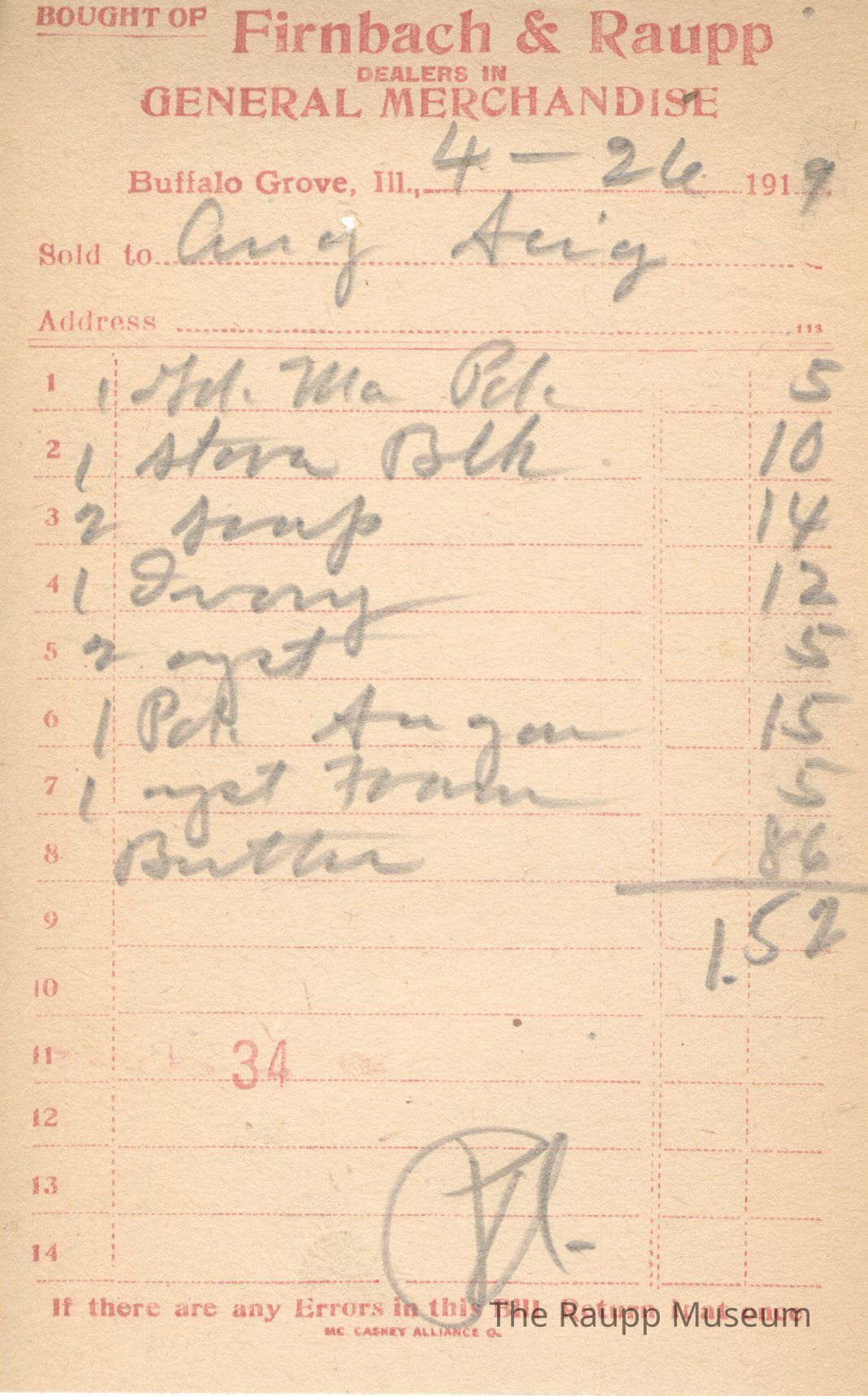 One (1) Firnbach and Raupp store receipt from April 26, 1919. Receipt is rectangular with red printed text and written notes in pencil. The receipt is for Aug. Seig, who bought 1 (?) for $0.05, 2 stove black for $0.10, 2 soap for $0.14, 1 Ivory for $0.12, 2 yst for $0.05, 1 pd. sugar for $0.15, 1 yst foam for $0.05, and butter for $0.86. Bill total was $1.52. There is a red "34" stamp near the bottom of the bill. The bill is marked as paid.