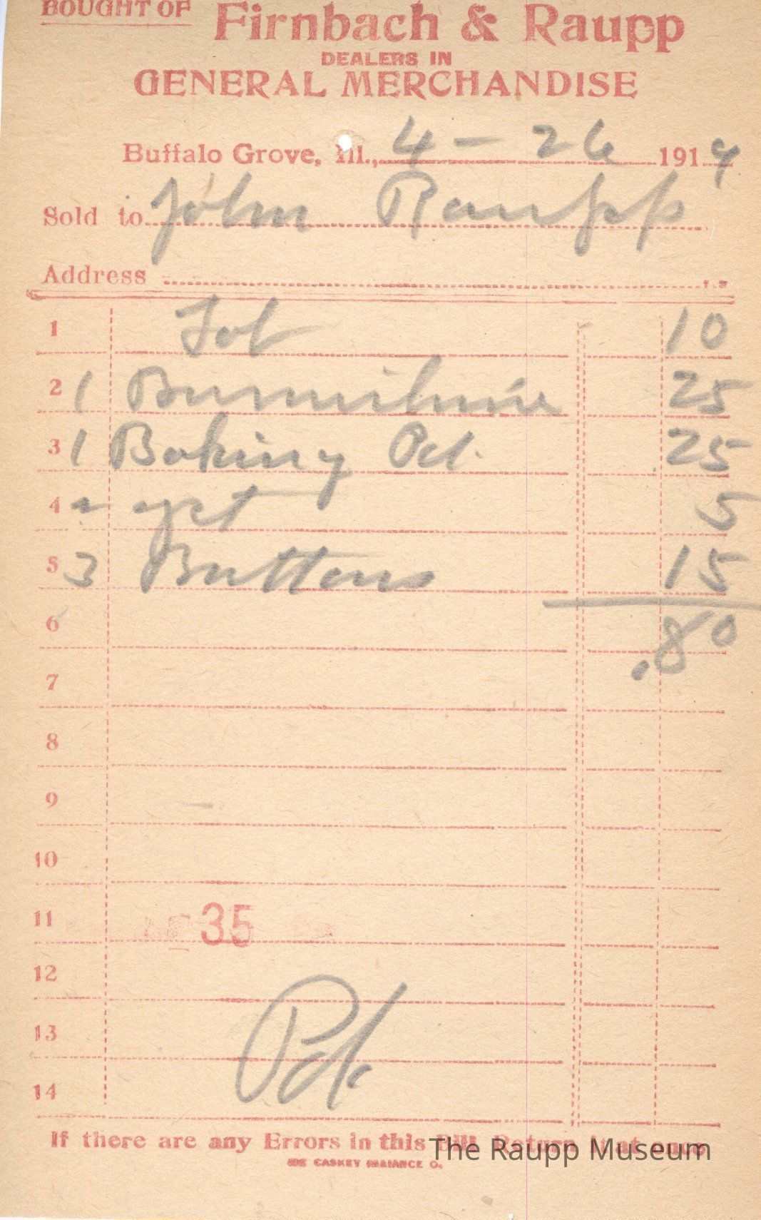 One (1) Firnbach and Raupp store receipt from April 26, 1919. Receipt is rectangular with red printed text and written notes in pencil. The receipt is for John Raupp, who paid 1 tab for $0.10, and bought 1 (?) for $0.25, 1 baking pd. for $0.25, 2 yst for $0.05, and 3 buttons for $0.15. Bill total was $0.80. There is a red "35" stamp near the bottom of the bill. The bill is marked as paid.
