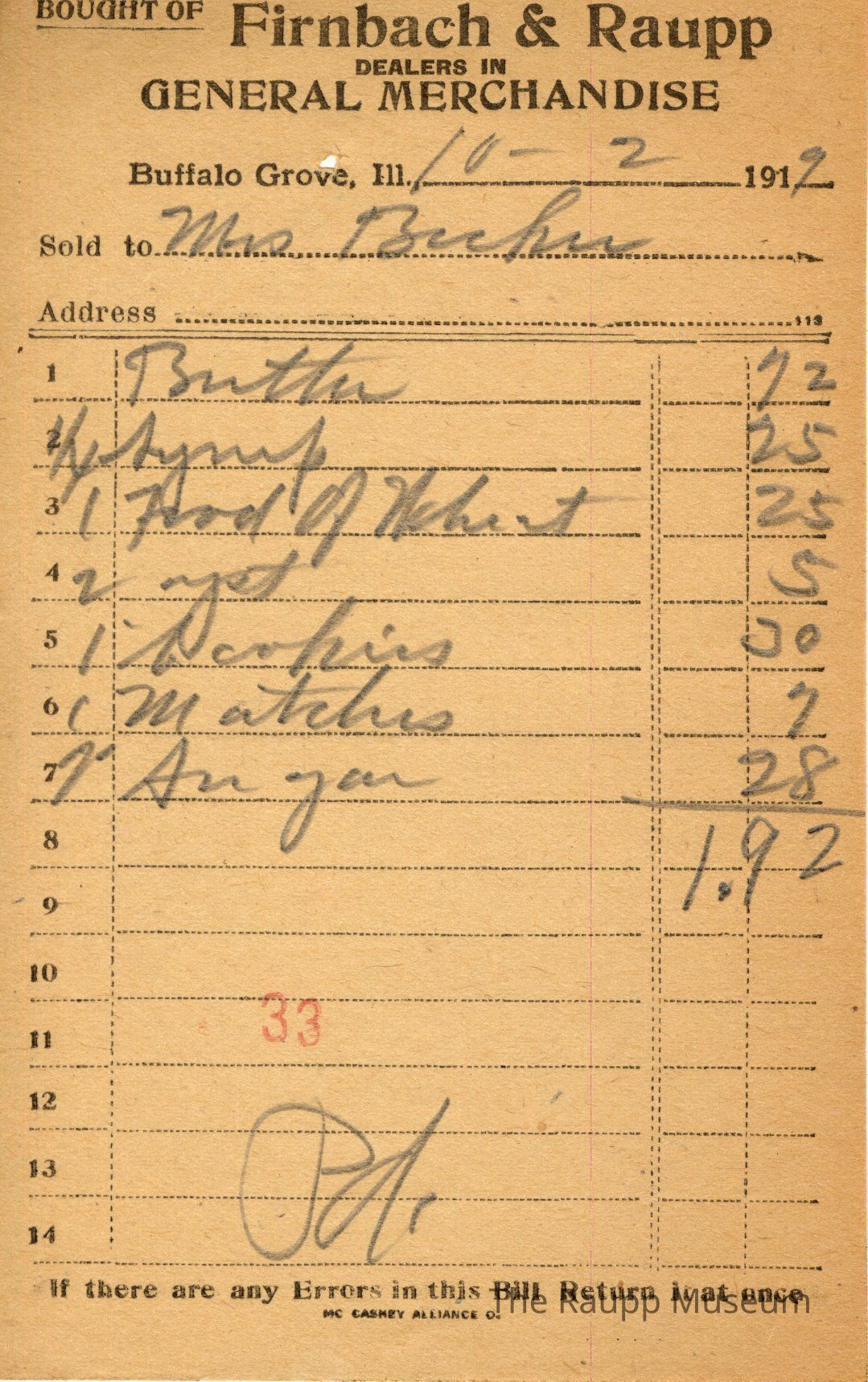 One (1) Firnbach and Raupp store receipt from October 2, 1919. Receipt is rectangular with black printed text and written notes in pencil. The receipt is for Mrs. Beecher, who bought one butter for $0.72, one-fourth syrup for $0.25, one Food of Wheat for $0.25, two yeast for $0.05, one cookies for $0.30, one matches for $0.07, and two pounds of sugar for $0.28. The bill total is $1.92 and the receipt is marked as paid. A red stamp of 33 is located towards the bottom of the page. The text from top to bottom is: BOUGHT OF Firnbach & Raupp; DEALERS IN GENERAL MERCHANDISE; Buffalo Grove, Ill.; Sold to; Address; If there are any Errors in this Bill Return It at once; MC CASKEY ALLIANCE O.Archive Details