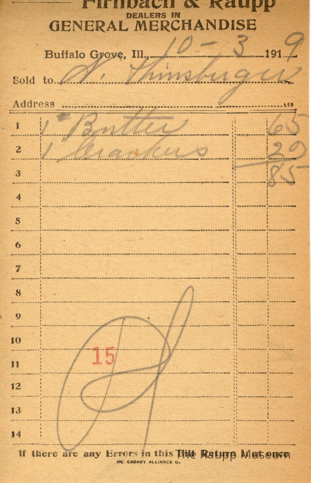 One (1) Firnbach and Raupp store receipt from October 3, 1919. Receipt is rectangular with black printed text and written notes in pencil. The receipt is for N. Hinsberger (?), who bought one pound of butter for $0.65 and one pound of crackers for $0.20. The bill total is $0.85 and the receipt is marked as paid. A red stamp of 15 is located towards the bottom of the page. The text from top to bottom is: BOUGHT OF Firnbach & Raupp; DEALERS IN GENERAL MERCHANDISE; Buffalo Grove, Ill.; Sold to; Address; If there are any Errors in this Bill Return It at once; MC CASKEY ALLIANCE O.Archive Details