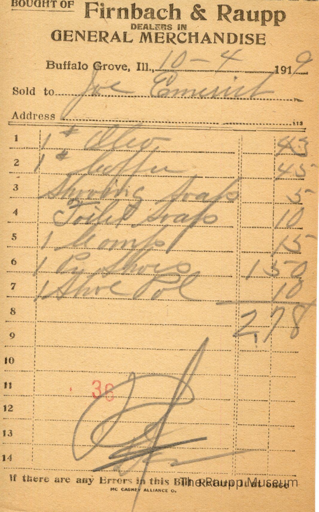One (1) Firnbach and Raupp store receipt from October 4, 1919. Receipt is rectangular with black printed text and written notes in pencil. The receipt is for Joe Emmerich, who bought one pound of oleo for $0.43, one pound of coffee for $0.45, shaving soap for $0.05, toilet soap for $0.10, one lamp for $0.15, one pair of shoes for $1.50, and one shoe polish for $0.10. The bill total is $2.78 and the receipt is marked as paid. A red stamp of 36 is located towards the bottom of the page. The text from top to bottom is: BOUGHT OF Firnbach & Raupp; DEALERS IN GENERAL MERCHANDISE; Buffalo Grove, Ill.; Sold to; Address; If there are any Errors in this Bill Return It at once; MC CASKEY ALLIANCE O.Archive Details