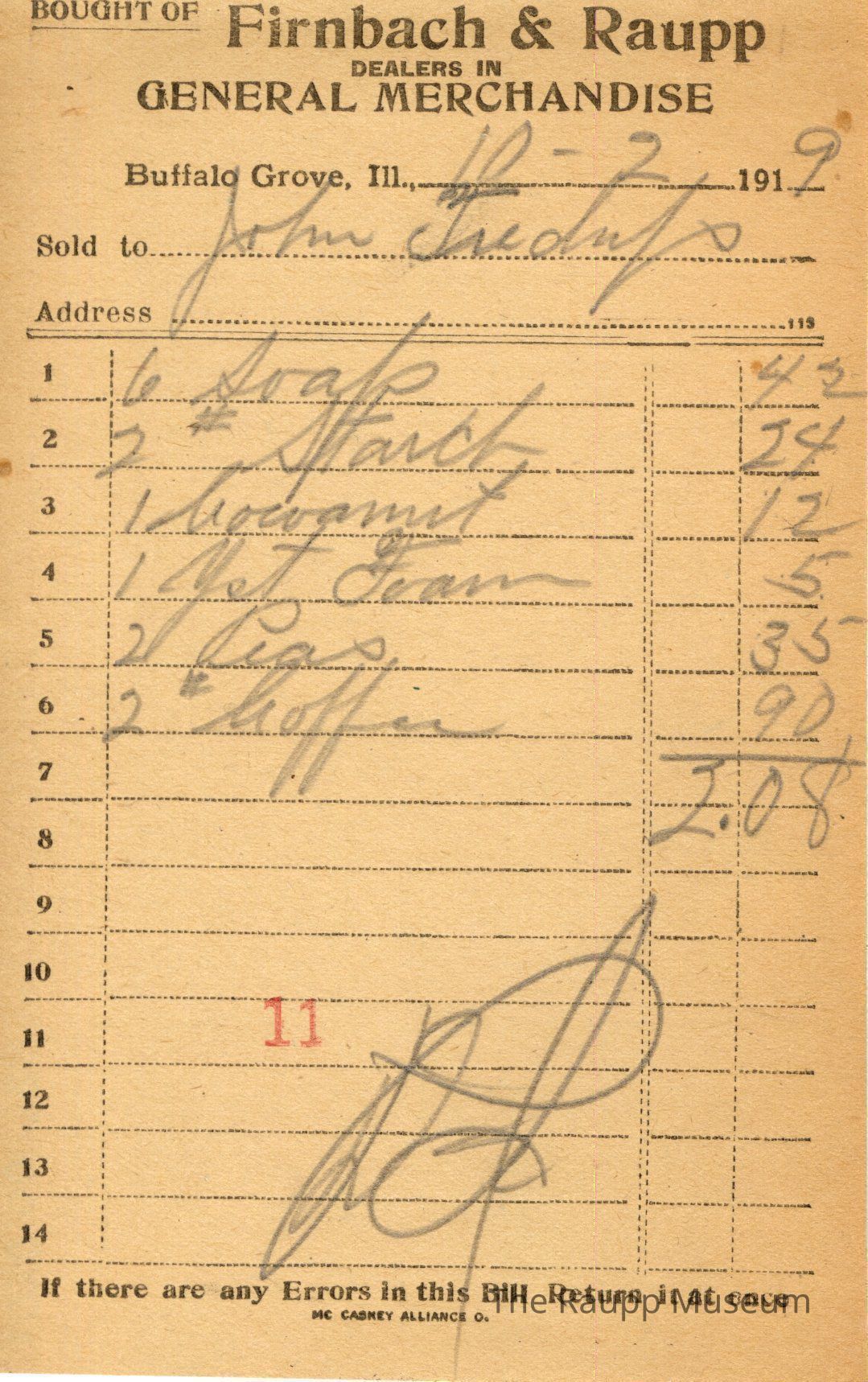 One (1) Firnbach and Raupp store receipt from October 2, 1919. Receipt is rectangular with black printed text and written notes in pencil. The receipt is for John Tudup, who bought six soaps for $0.42, two pounds of starch for $0.24, one coconut for $0.12, one yeast foam for $0.05, two peas for $0.35, and two pounds of coffee for $0.90. The bill total is $2.08 and the receipt is marked as paid. A red stamp of 11 is located towards the bottom of the page. The text from top to bottom is: BOUGHT OF Firnbach & Raupp; DEALERS IN GENERAL MERCHANDISE; Buffalo Grove, Ill.; Sold to; Address; If there are any Errors in this Bill Return It at once; MC CASKEY ALLIANCE O.Archive Details