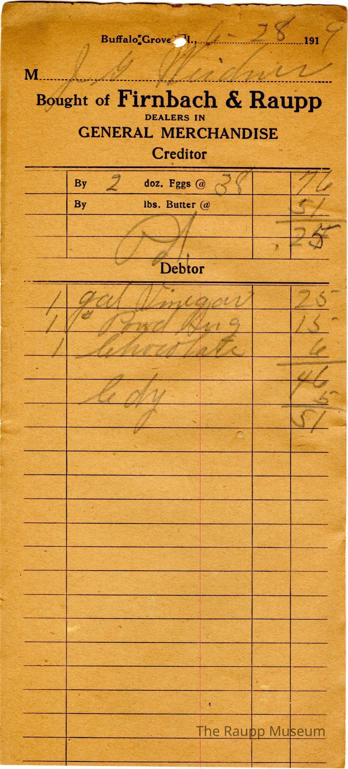 The black text is as follows, Bought of Firnbach and Raupp; Dealers in; General Merchandise; Creditor; By, doz. eggs; By, lbs butter; Debtor