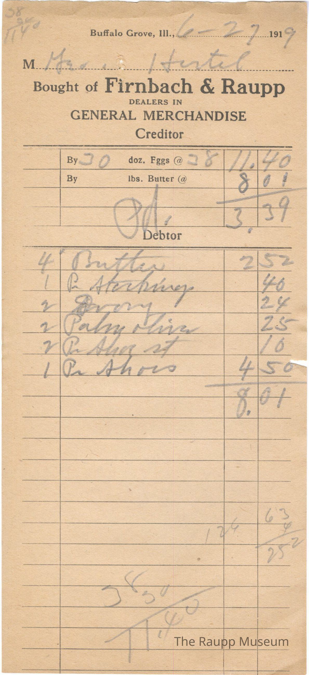 One (1) Firnbach and Raupp store receipt from June 27, 1919. Receipt is rectangular with black printed text and written notes in pencil. The receipt is for Geo Hertel, who brought 30 doz. eggs at $0.38 for $11.40. In addition, he bought four butter for $2.52, one pair of stocking for $0.40, two ivory for $0.24, two Palmolive for $0.25, two shoe (?) for $0.10, and one pair of shoes for $4.50. The bill total is $8.01. The creditor total ($11.40) is subtracted by the debtor bill total ($8.01). The final credit given is $3.39.