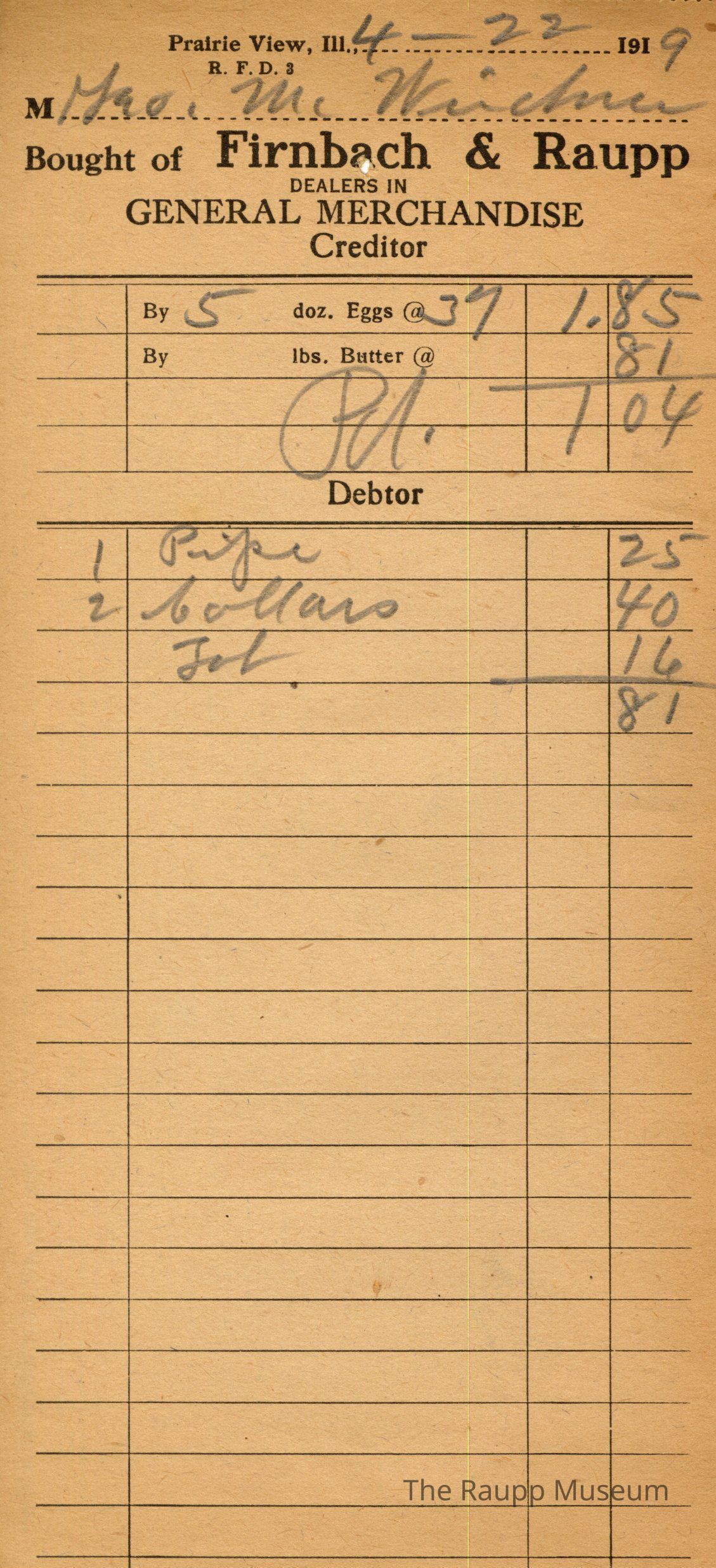 One (1) Firnbach and Raupp store reciept from April 22, 1919. Receipt is rectangular with black printed text and written notes in pencil. The receipt is for Mrs. Mc(?) Weidner, who sold 5 dozen eggs at $0.37 for $1.85, and butter for $0.81, for a credit of $1.04. The credit is marked as paid. She bought 1 pipe for $0.25, 2 collars for $0.40 and tab for $0.16. Bill total was $0.81.
