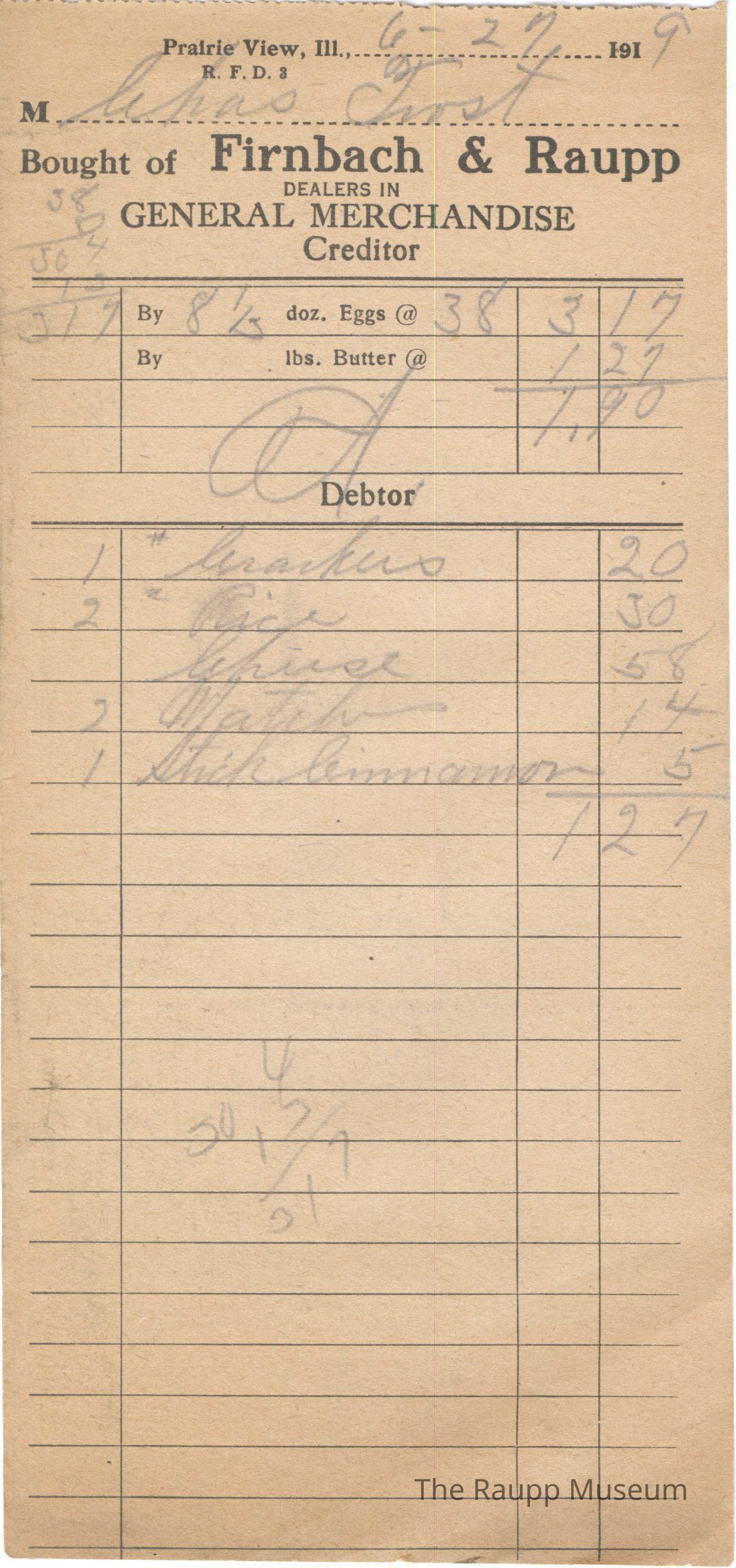 One (1) Firnbach and Raupp store receipt from June 27, 1919. Receipt is rectangular with black printed text and written notes in pencil. The receipt is for Chas (?), who brought 8-1/3 doz. eggs at $0.38 for $3.17. In addition, he bought one pound of crackers for $0.20, two pounds of rice for $0.30, cheese for $0.58, two matches for $0.14, and one stick cinnamon for $0.05. The bill total is $1.27. The creditor total ($3.17) is subtracted by the debtor bill total ($1.27). The final credit given is $1.90.