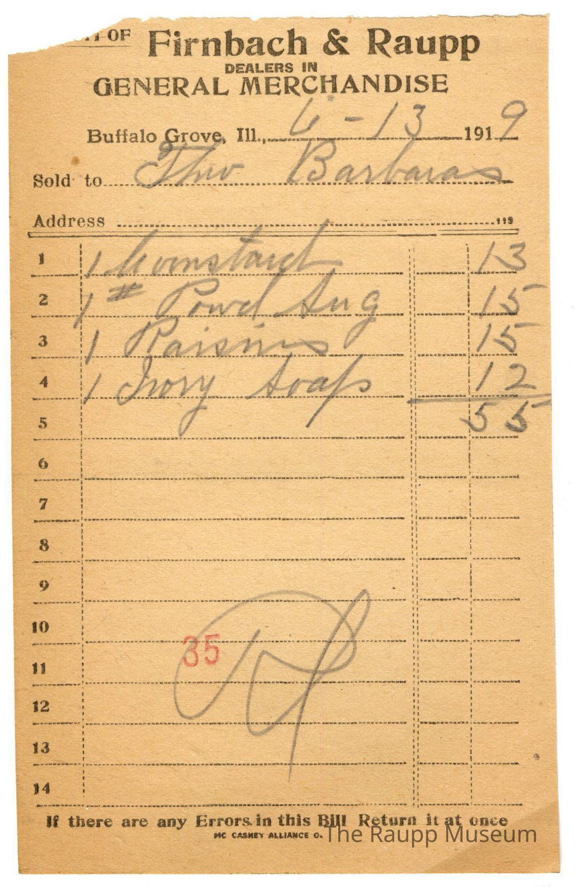 The black text is as follows, from top to bottom: "of Firnbach & Raupp (the "Bought" has been torn off), Dealers in GENERAL MERCHANDISE; Buffalo Grove Ill.; Sold to; Address; If there are any Errors in this Bill Return it at once; MC CASKEY ALLIANCE O.Archive Details