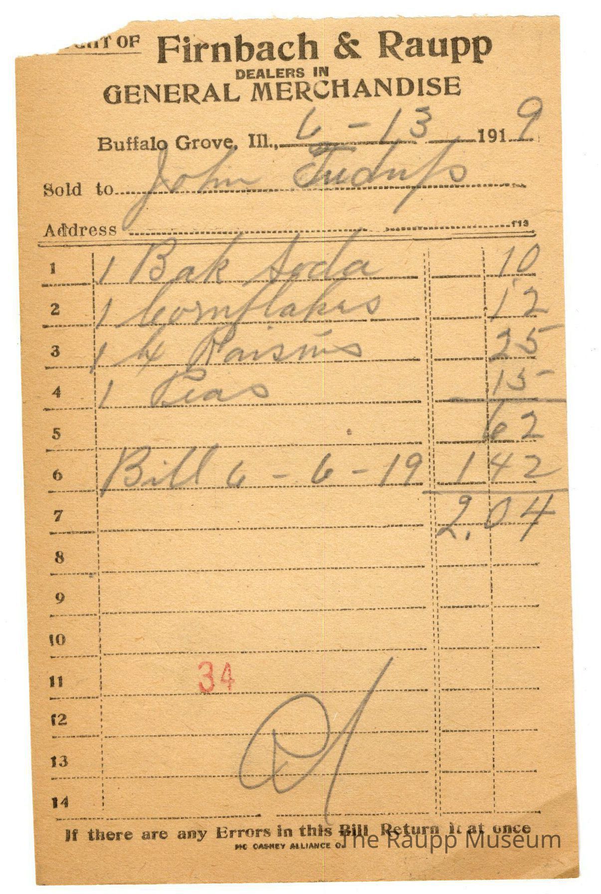 One (1) Firnbach and Raupp store receipt from June 13, 1919. Receipt is rectangular with black printed text and written notes in pencil. The receipt is for John Tudup?, who bought one baking soda for $0.10, one cornflakes for $0.12, one box raisins for $0.25, one peas for $0.15. Bill total is $0.62; however, a $1.42 bill from 06-06-19 was added bringing the total to $2.04 There's a red stamp of 34 close to the bottom, with the bill marked as paid (written as "Pd.").