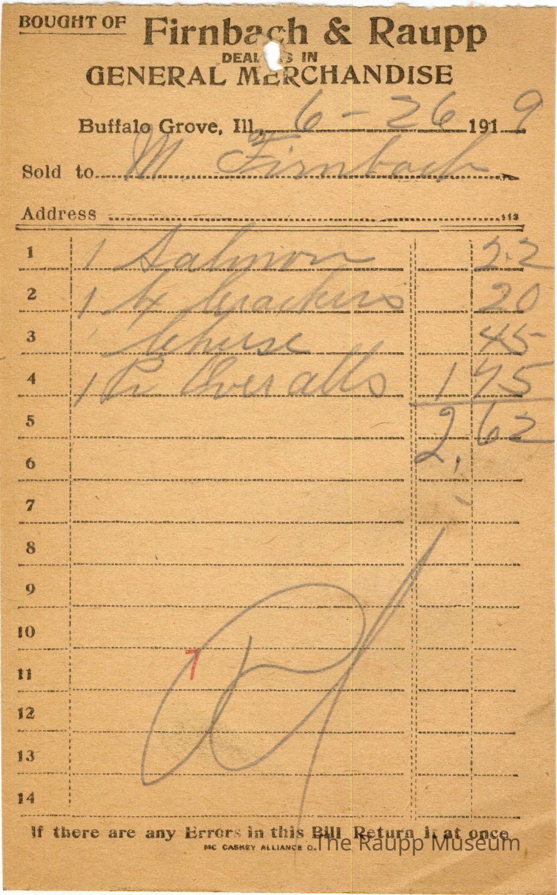The black text is as follows, Bought of Firnbach and Raupp; Dealers in; General Merchandise; Buffalo Grove Ill.; Sold to; Address; If there are any Errors in this Bill Return it at once; MC CASKEY ALLIANCE O.