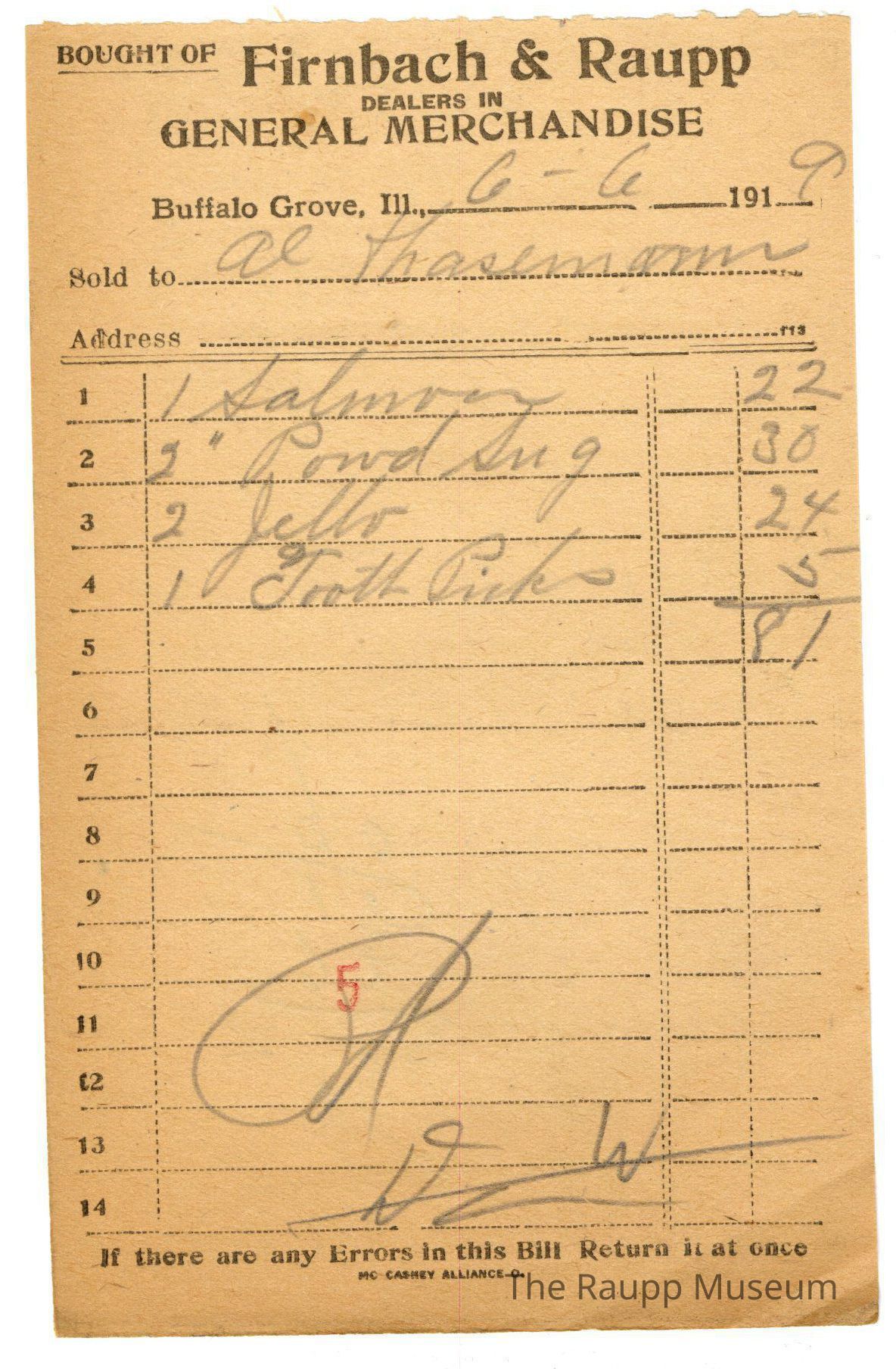 The black text is as follows, from top to bottom: Bought of Firnbach & Raupp, Dealers in GENERAL MERCHANDISE; Buffalo Grove Ill.; Sold to; Address; If there are any Errors in this Bill Return it at once; MC CASKEY ALLIANCE O.Archive Details