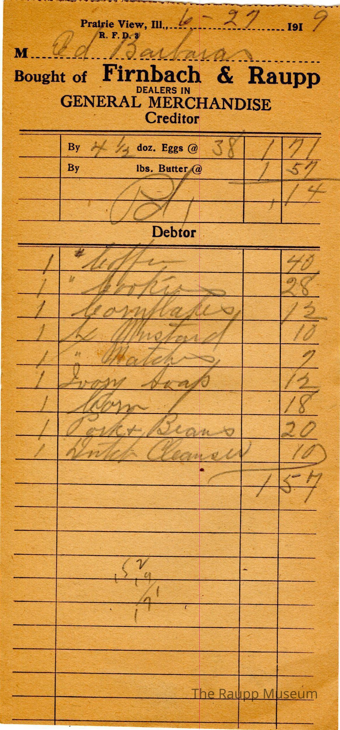 One (1) Firnbach and Raupp store receipt from June 27, 1919. Receipt is rectangular with black printed text and written notes in pencil. The receipt is for Ed Barbaras (?), who brought 4-1/2 doz. eggs at $0.38 for $1.71. In addition, he bought one # (pound) of coffee for $0.40, one " (continuation of pound) of cookies for $0.28, one cornflakes for $0.12, one bx (box) of mustard for $0.10, one " (continuation of box) of matches for $0.07, one ivory soap for $0.12, one corn for $0.18, one pork + beans for $0.20, and one Dutch cleaner (Old Dutch Cleaner) for $0.10. The bill total is $1.57. The creditor total ($1.71) is subtracted by the debtor bill total ($1.57). The final credit given is $0.14.