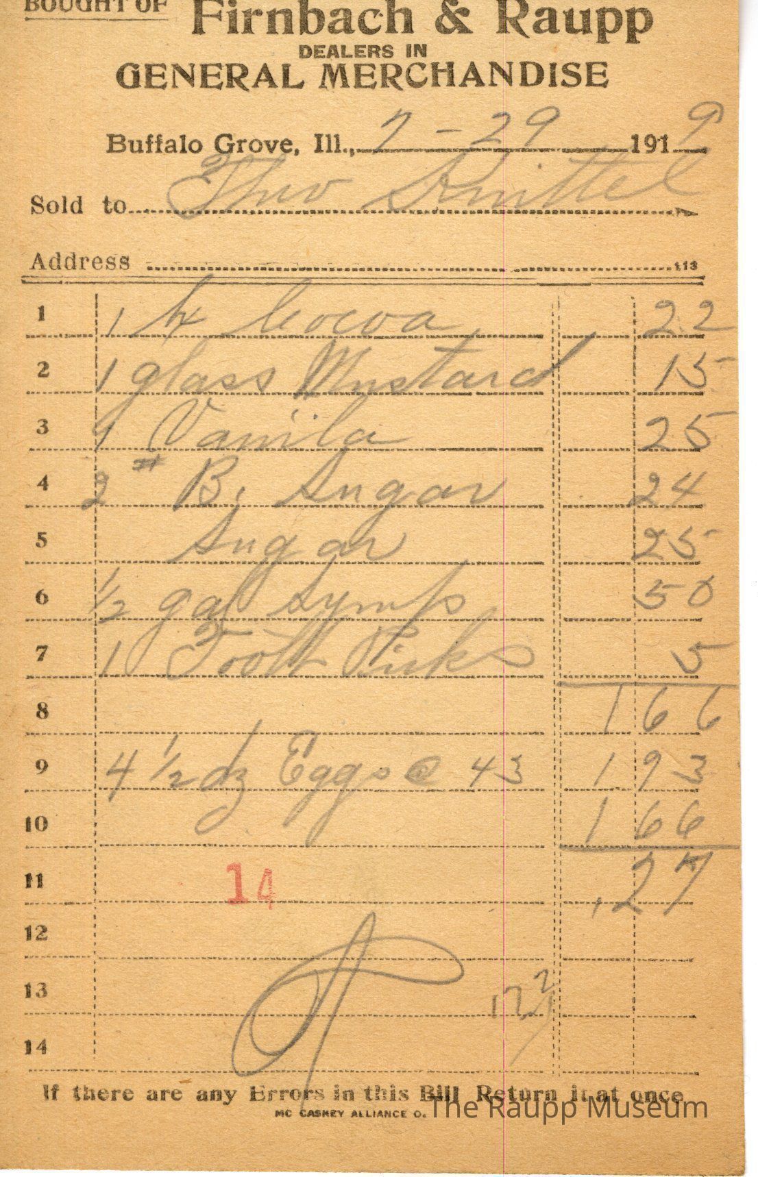 One (1) Firnbach and Raupp store receipt from July 29, 1919. Receipt is rectangular with black printed text and written notes in pencil.