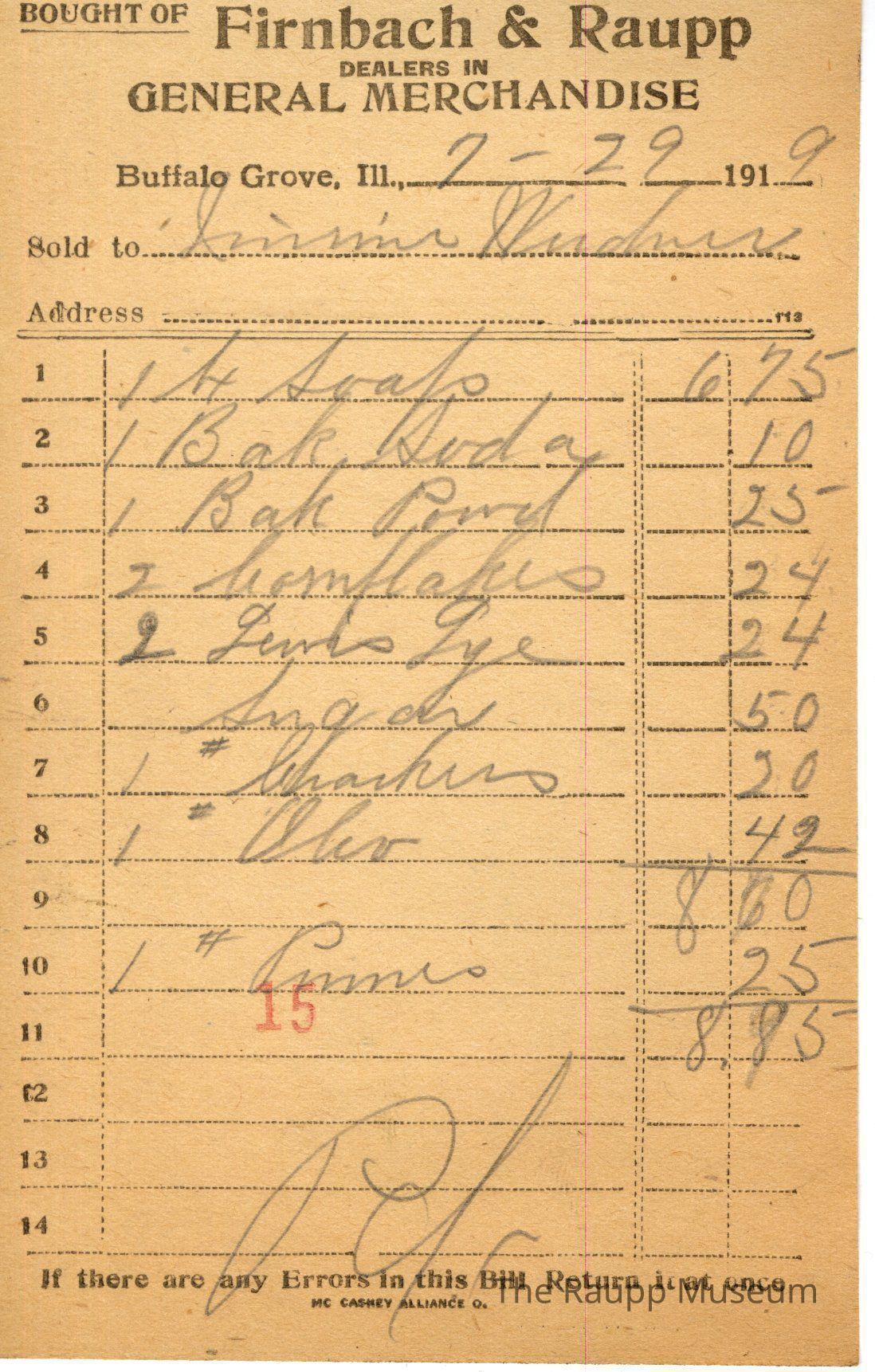 The black text is as follows, from top to bottom: Bought of Firnbach & Raupp; DEALERS IN; GENERAL MERCHANDISE; Buffalo Grove, Ill; Sold to; Address; If there are any Errors in this Bill, Return it at once; Mc Caskey Alliance CoArchive Details