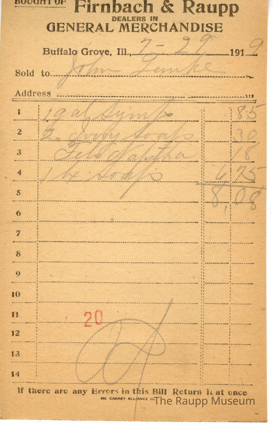 One (1) Firnbach and Raupp store receipt from July 29, 1919. Receipt is rectangular with black printed text and written notes in pencil.