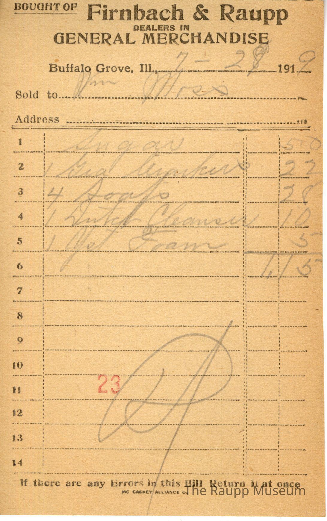 The black text is as follows, from top to bottom: Bought of Firnbach & Raupp; DEALERS IN; GENERAL MERCHANDISE; Buffalo Grove, Ill; Sold to; Address; If there are any Errors in this Bill, Return it at once; Mc Caskey Alliance CoArchive Details