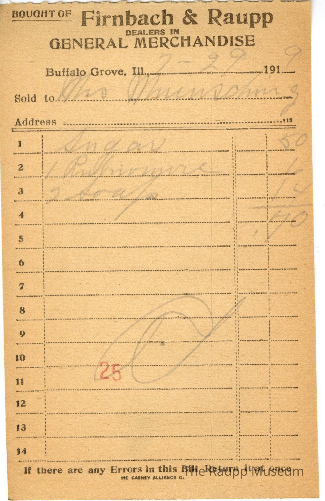The black text is as follows, from top to bottom: Bought of Firnbach & Raupp; DEALERS IN; GENERAL MERCHANDISE; Buffalo Grove, Ill; Sold to; Address; If there are any Errors in this Bill, Return it at once; Mc Caskey Alliance CoArchive Details