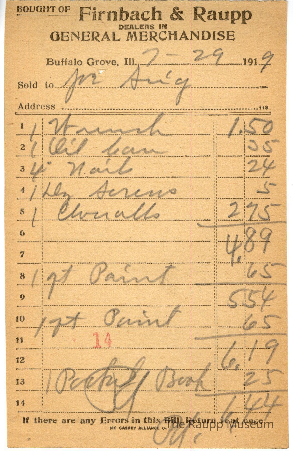 The black text is as follows, from top to bottom: Bought of Firnbach & Raupp; DEALERS IN; GENERAL MERCHANDISE; Buffalo Grove, Ill; Sold to; Address; If there are any Errors in this Bill, Return it at once; Mc Caskey Alliance CoArchive Details