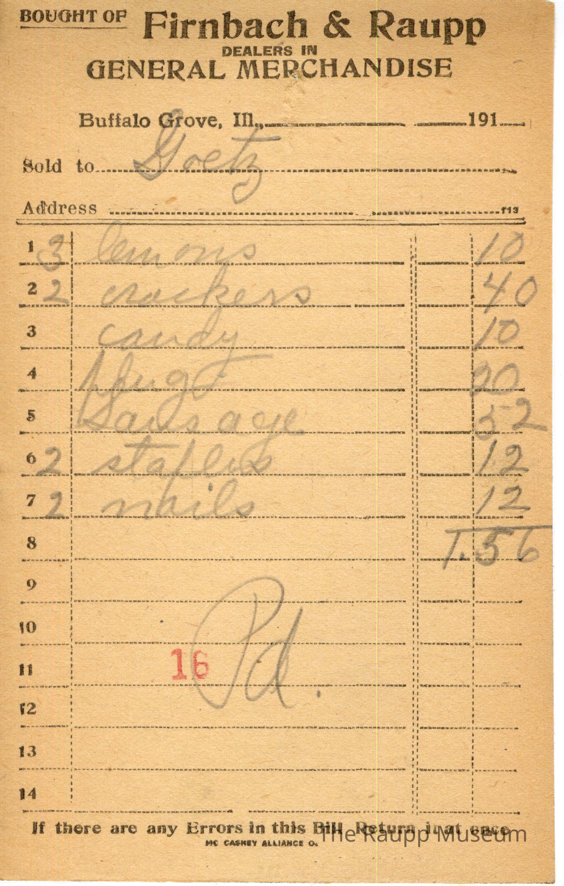 The receipt is for Goetz who bought 3 lemons for $0.10, 2 crackers for $0.40, candy for $0.10, 1 plug for $0.20, sausage for $0.32, 2 staples(?) for $0.12, and 2 nails for $0.12. The bill total was $1.56.The bill was marked as paid, and there is a red stamp of "16" at the bottom of the receipt.